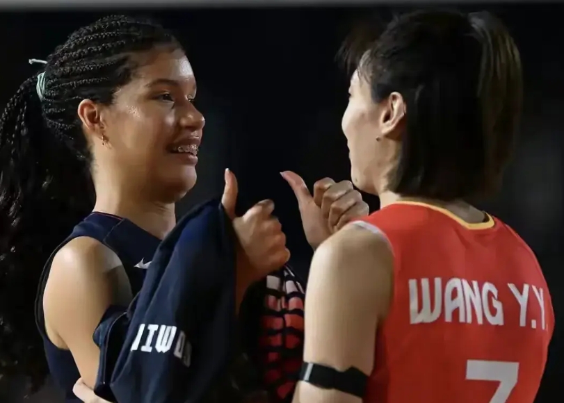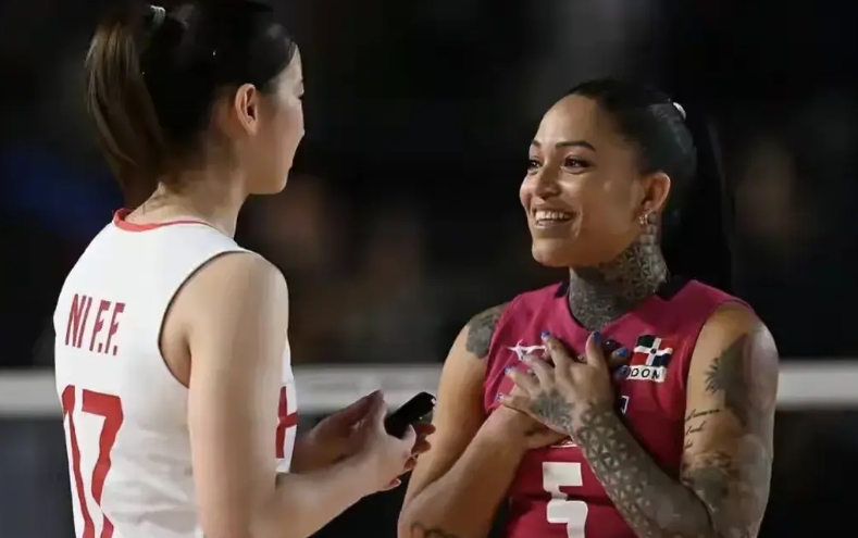 中国女排在世锦赛小组赛收官战3-0完胜多米尼加女排,将她们“推给”了巴西女排,赛后,两队队员亲切交流,气氛融洽,倪非凡与多米尼加队的世界著名自由人卡斯蒂略打招呼,王媛媛与曾在天津打球的前队友塔皮亚合影留念。