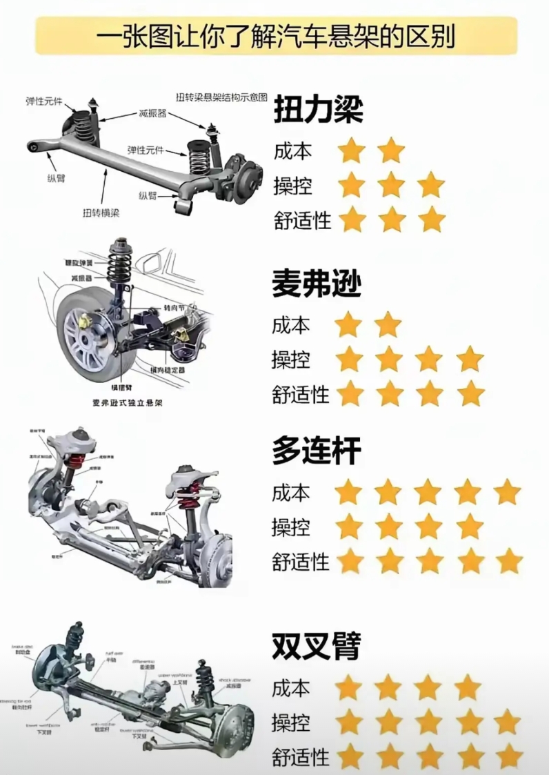 看到这个图片我总结下吧,不知道对不对 第一个是轴拖曳臂,也就是扭力梁, 第二个是前轴麦弗逊, 第三个是前轴双叉臂, 第四个是后轴双叉臂,