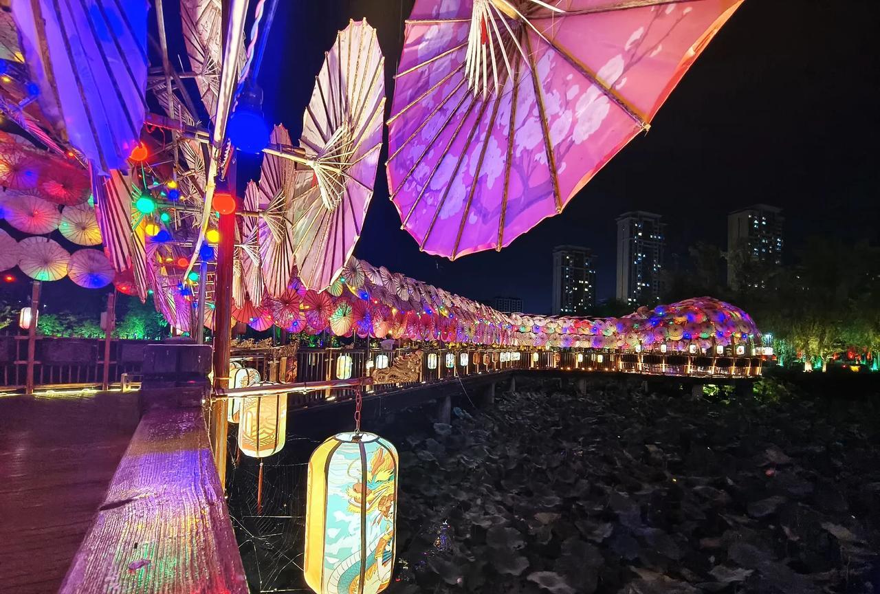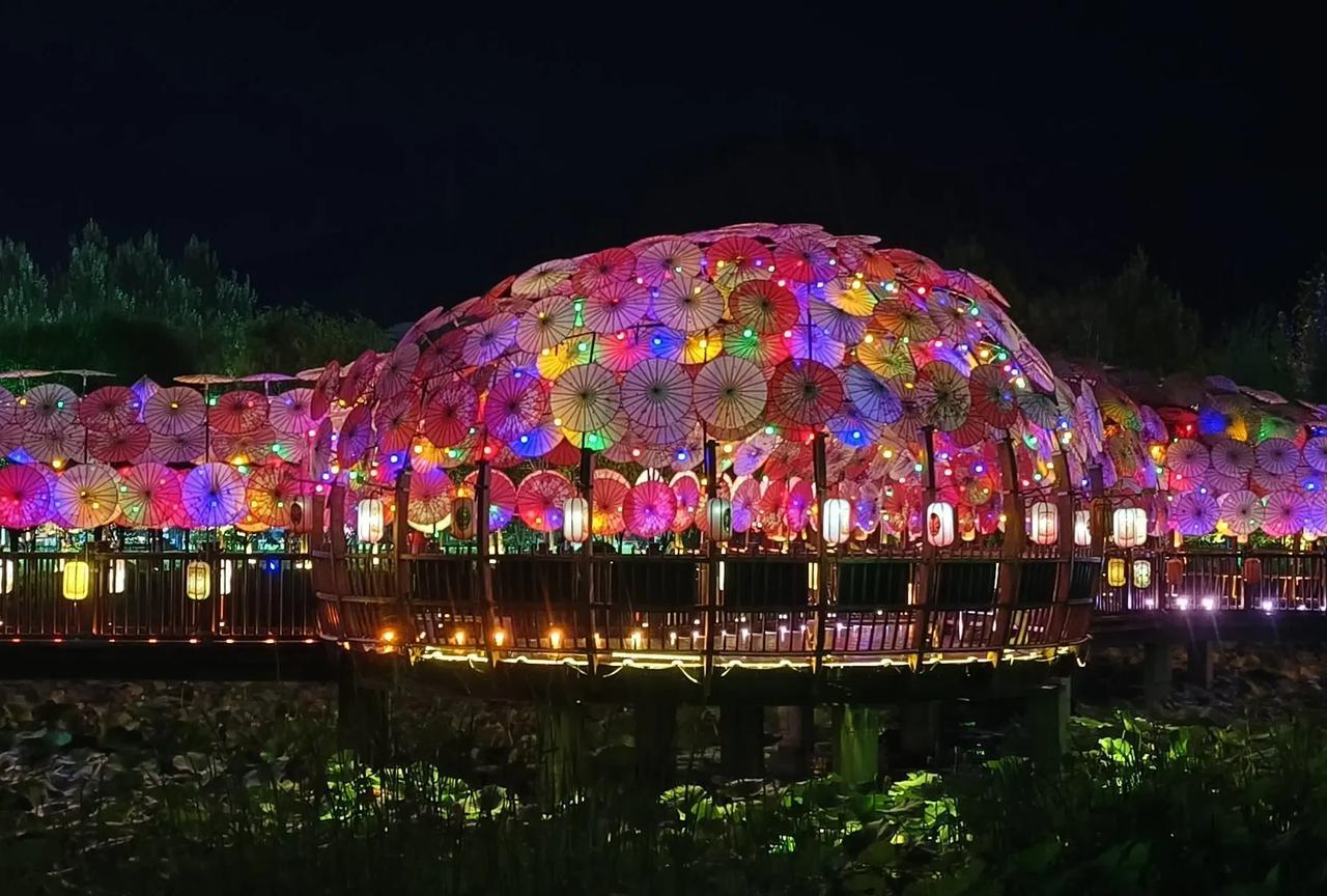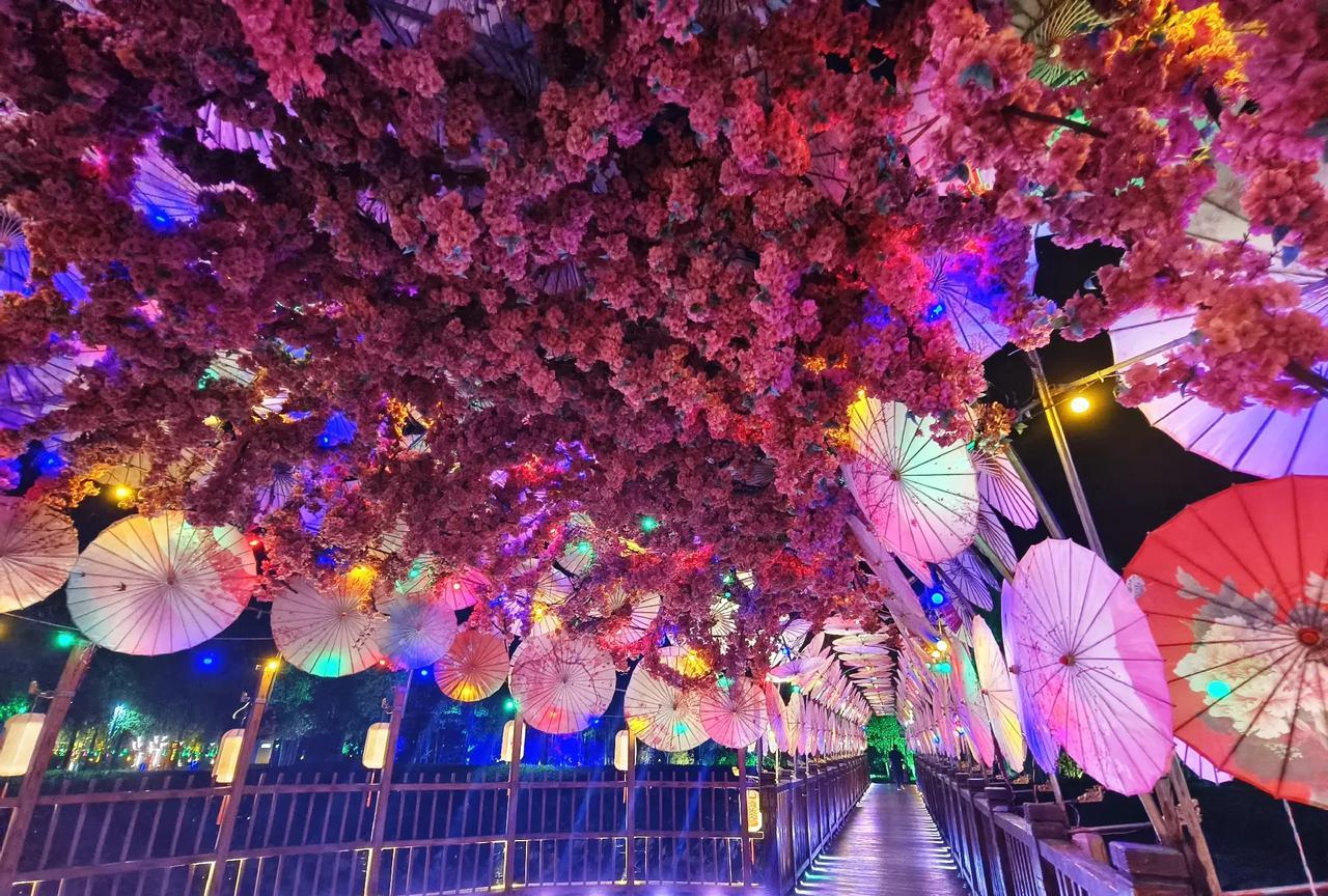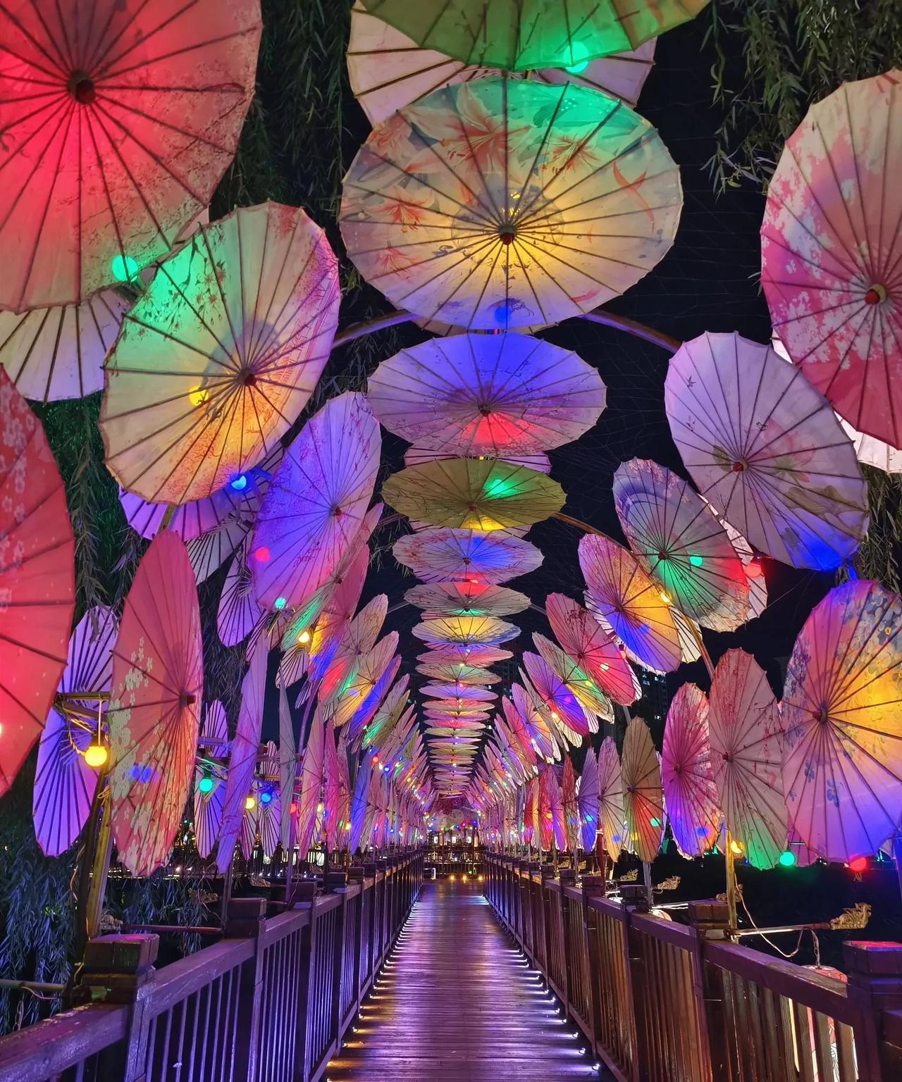 通化佟佳江旅游度假区里用花纸伞打造的彩桥