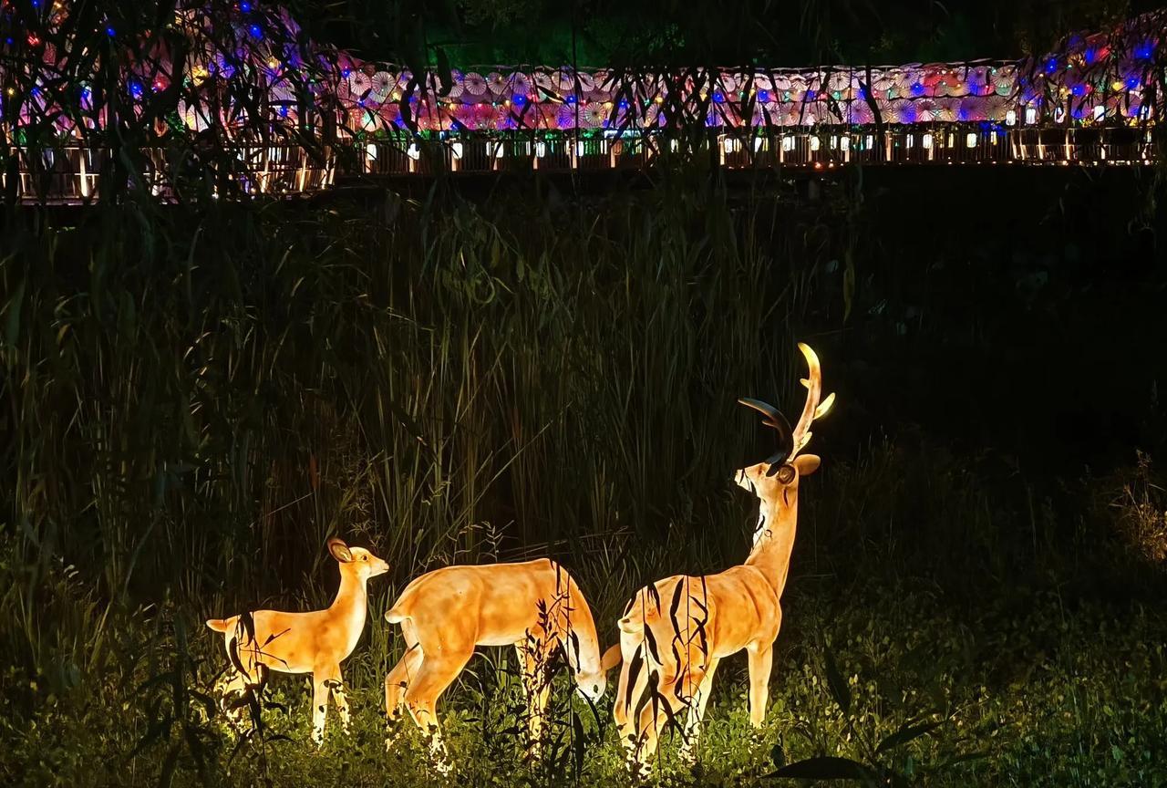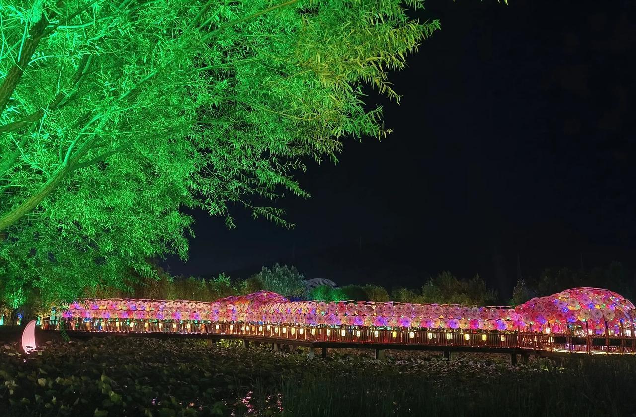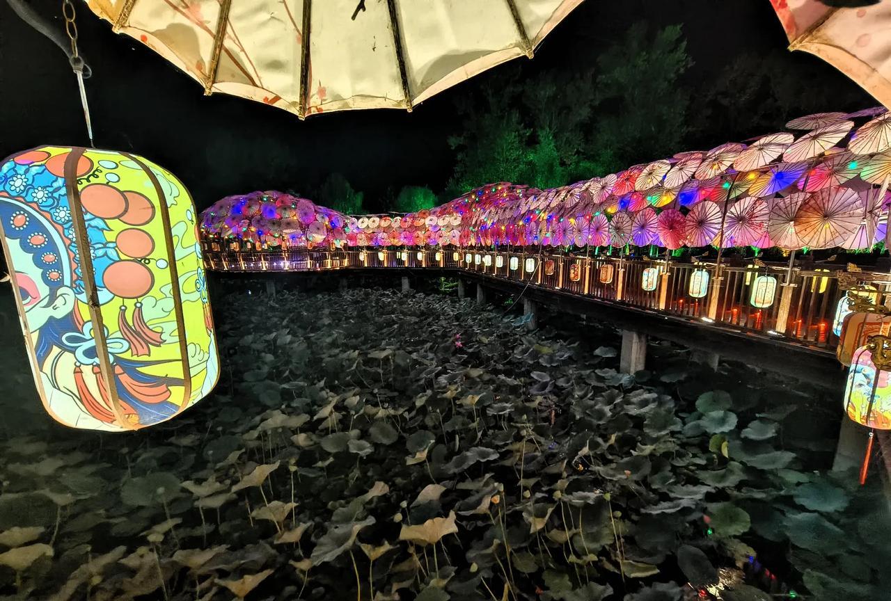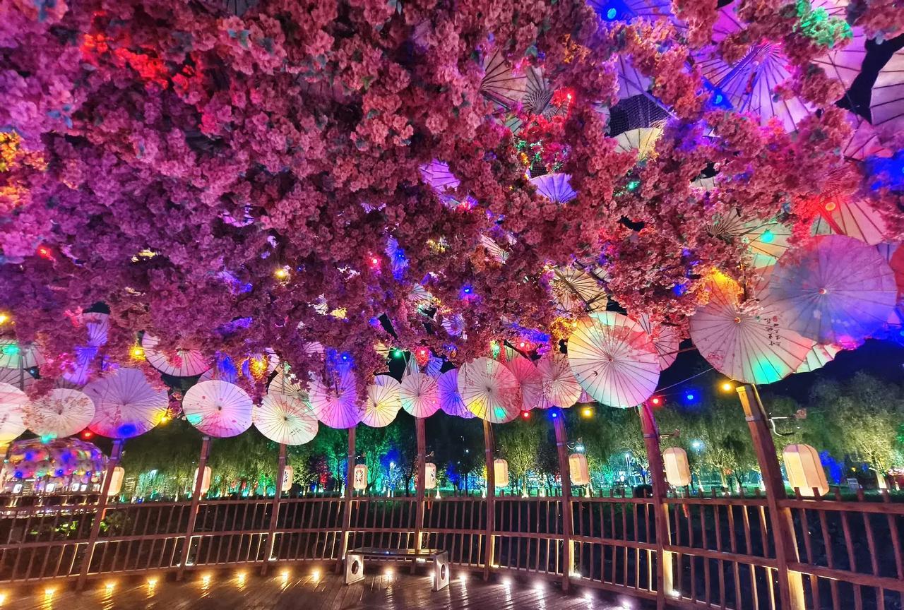 通化佟佳江旅游度假区里用花纸伞打造的彩桥