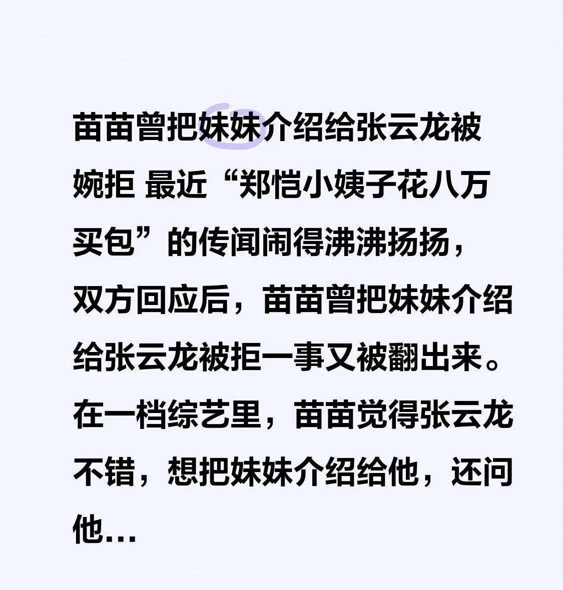 苗苗曾把妹妹介绍给张云龙被婉拒 苗苗曾经把自己的妹妹介绍给张云龙,却遭到了婉拒。 最近啊,“郑恺小姨子花八万买包”的传闻传得那叫一个热闹非凡,在双方都作出回应之后呢,苗苗曾把妹妹介绍给张云龙被拒这件事又被大家给翻了出来。在一档综艺节目里,苗苗觉得张云龙这个人很不错,就动了把妹妹介绍给他的心思,还问张云龙靠不靠谱呢。张云龙开玩笑似的表示自己不靠谱,让苗苗放过她妹妹。并且他还解释说苗苗的妹妹不在这个行业,他想要找一个能有共同话题可聊的人。 张云龙一直都没能大火起来,不过呢,他好像还挺享受这种状态的,不被太多的人所打扰。他曾经在《海上繁花》里饰演的邵医生那可是相当深情的,本来大家都以为他能够凭借这个角色火起来呢,结果却还是没能出圈。看起来他对火不火这件事并不是很在意,这种想法也算是挺独特的了。 #浪姐苗苗# #张云龙# #张云龙穿搭#