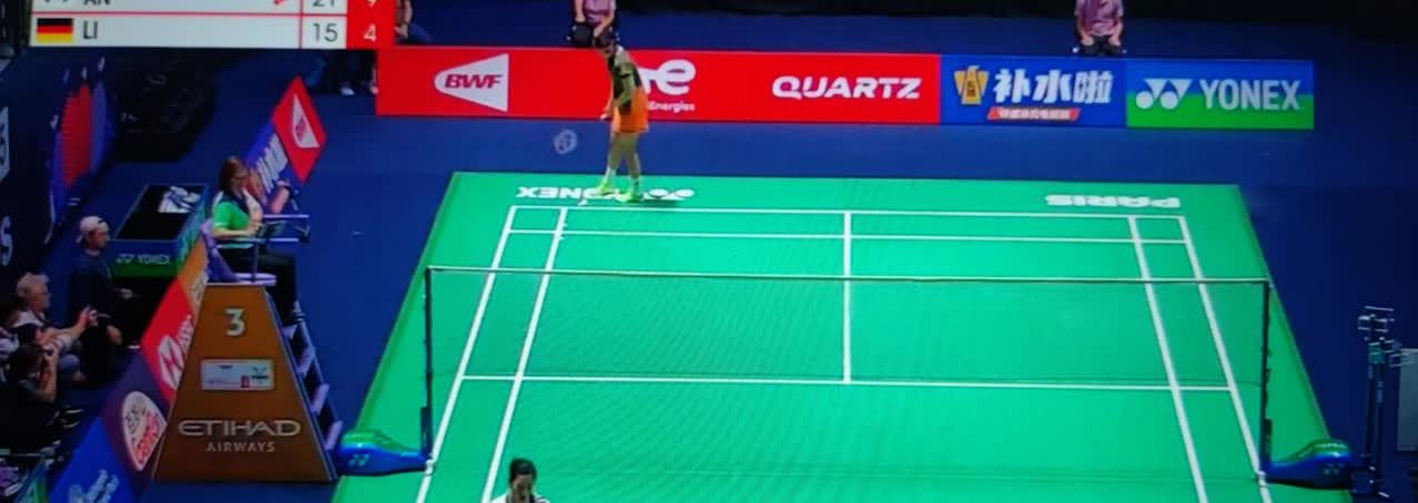 羽毛球世锦赛女单比赛,安洗莹对阵德国选手李怡逢。安洗莹21:15赢下首局,第二局