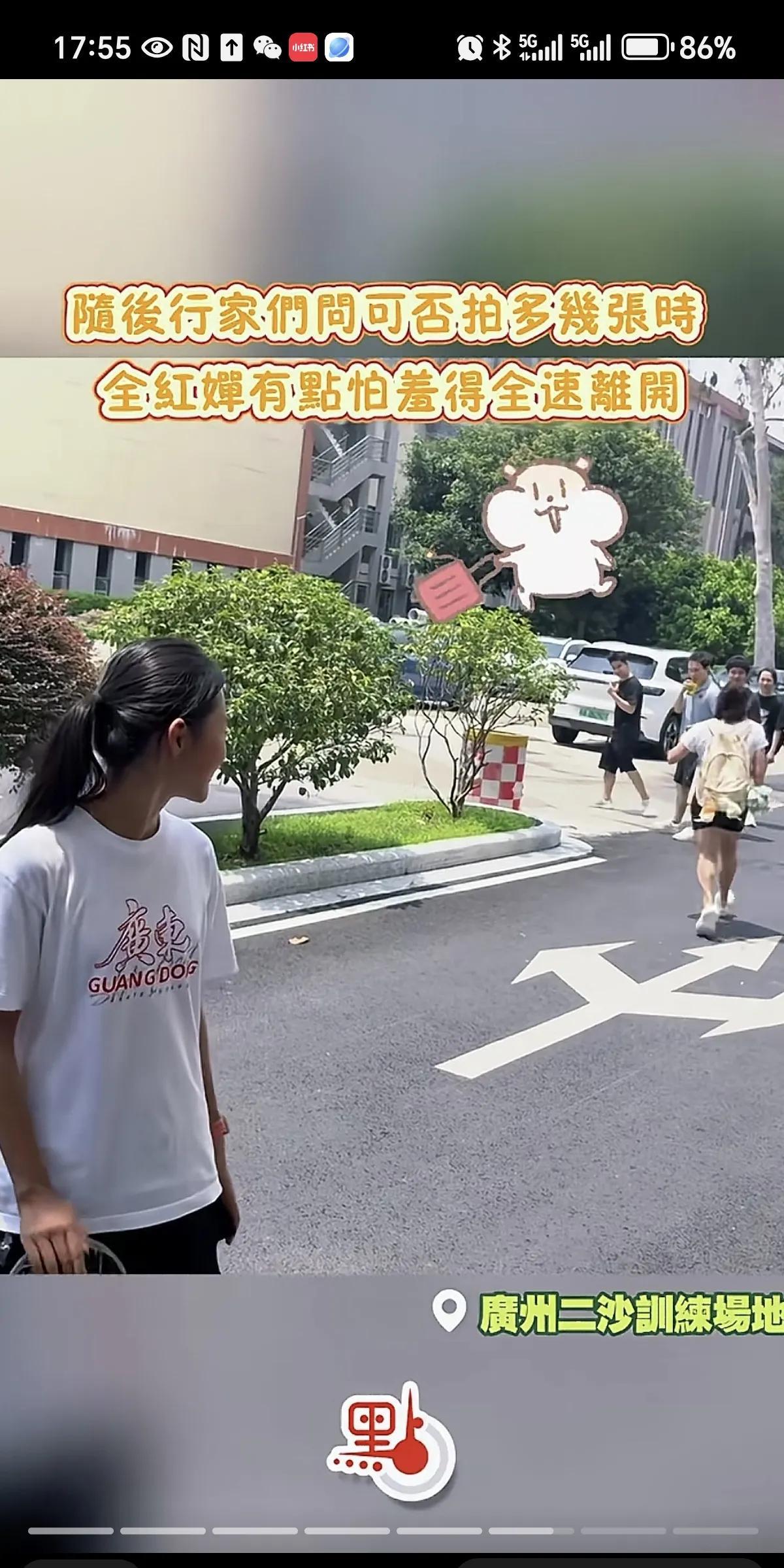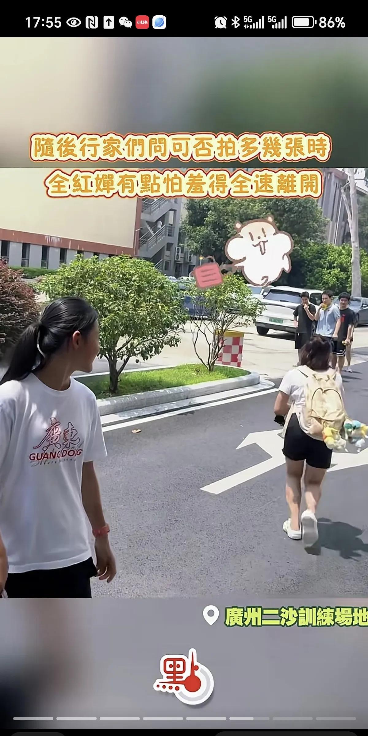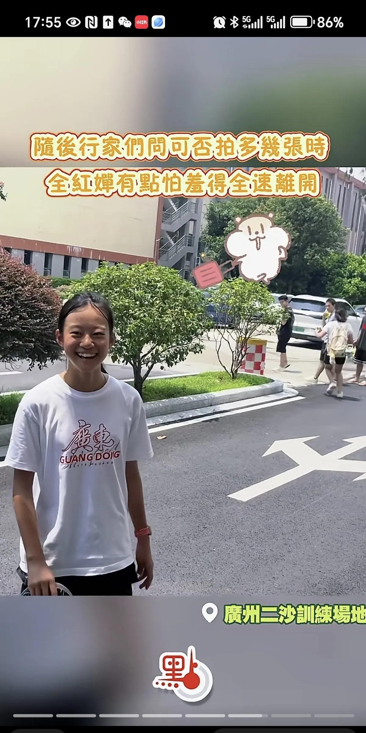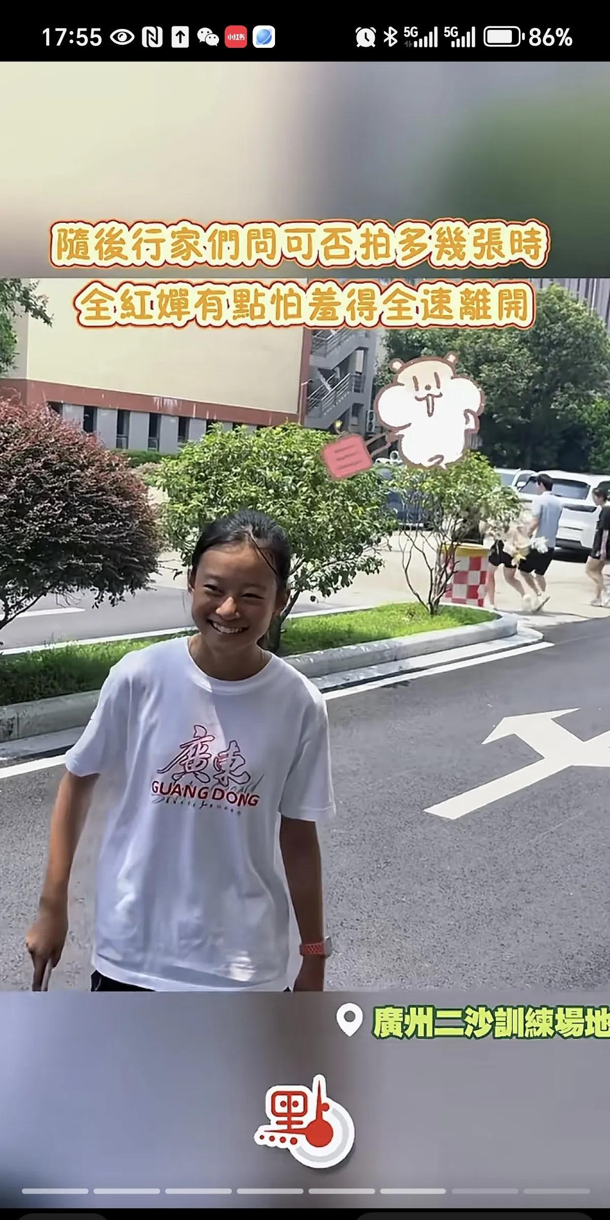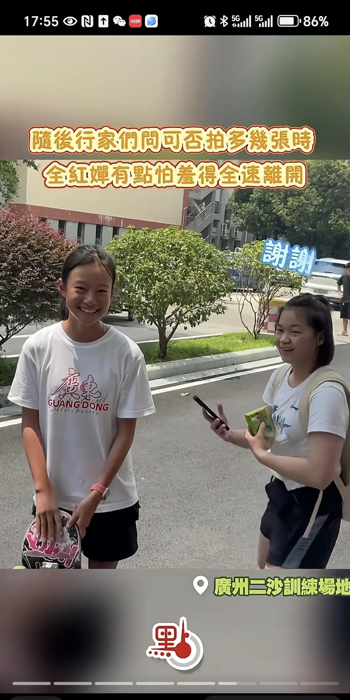 08月27日,新鲜的全红婵出来了,久违未见全红婵,感觉更丰满了,脸上还是嘟嘟有肉的,但手和腿好像比之前瘦了点,感觉想回到奥运会那时的身材有点难,毕竟长开了,骨架也大了,能保持现有水平已经很不错了 全红婵看见广东滑板小将郑好好时,开心的跟对方合影,成功追星后,全红婵礼貌的跟郑好好说:谢谢,两人还聊了一会,然后全红婵飞奔的跑向谢思锡等队友那里,郑好好也是开心的看着全红婵,久久不愿离去 广东队的队友都蛮宠全红婵的,宠溺的眼神望着全红婵追星,自己乖乖的在原地等全红婵,开朗的全红婵,跟着一堆哥哥隔着屏幕都能感觉到她的开心和快乐,真是太可爱了