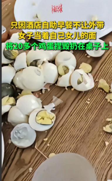 “这就是占小便宜的代价!”,陕西,一女子带孩子吃酒店自助早餐,因服务员不同意外带,便当着孩子的面,将20个鸡蛋剥开,捏碎了丢在桌子上扬长而去。 8月26号早上,陕西有家酒店的自助餐厅里,出了件让不少人都看不过眼的事。 有个三十多岁的女的,带着孩子来吃酒店提供的免费自助早餐,本来好好吃饭没啥问题,可她吃完后却动了歪心思。 她先是偷偷往自己包里塞了些煮鸡蛋,之后又拿了二十多个鸡蛋放在桌上,看样子是想一起打包带走。 酒店里明明白白有规矩,自助餐只能在店里吃,不能外带,工作人员看到后赶紧过来劝,说这鸡蛋没法让她带走。 可谁知道,这女的不仅不听劝,反而一下子就火了。 她当场就把桌上剩下的十四个鸡蛋拿起来,一个个剥了皮,然后用手使劲捏碎,有的还直接砸在桌子上,蛋白和蛋黄弄得满桌都是。 她捏鸡蛋的时候下手特别狠,那股劲儿看着就吓人,整个人跟魔怔了似的。 旁边的人都看傻了,她孩子就站在旁边,一脸迷茫,还试着拉了拉她的衣服,可她连理都没理孩子,一门心思就想着撒气。 等把鸡蛋全毁完,她才拉着孩子气呼呼地匆匆离开了餐厅。 当时在场的工作人员,一开始只是用平和的语气提醒她不能外带,没说任何重话,可没想到会遭到拒绝,还看到她做出这种毁东西的事。 工作人员和旁边吃饭的顾客都目瞪口呆,完全没法理解她为啥因为这点事就这么极端。 后来有顾客还专门跟外人说,当时服务员态度真的没问题,就是正常提醒规则而已,不存在态度不好惹到她的情况。 酒店老板知道这事以后,赶紧去看了监控,看完气得直骂。 老板说自己干这行这么多年,见过不少想多吃点的客人,可从来没见过不让打包就直接毁东西的。 老板还忍不住念叨,自助餐本来就有规定不让外带,这女的素质也太差了,怎么能做出这种事。 说实在的,自助餐不让外带真不是酒店故意刁难,换个角度想,要是人人都像这女的一样,在店里吃饱了还打包一堆东西回家,那酒店的成本根本扛不住,生意也没法做了。 这是最基本的经营逻辑,稍微懂点事的人都该明白。 可这女的倒好,不仅不遵守规则,还用糟蹋食物的方式撒气。 现在还有不少人吃不饱饭,食物多宝贵啊,她倒好,拿鸡蛋当发泄工具,这行为实在是缺德。 更让人担心的是她带的那个孩子,孩子全程都在旁边看着,妈妈这个样子,孩子心里会怎么想? 是觉得这样撒泼很厉害,还是知道不对却不敢说? 家长本来是孩子的榜样,她这么做,完全是给孩子传递错误的价值观,以后孩子遇到问题,也会学着用撒泼耍横的方式解决问题。 这事传到网上后,网友们也都炸开了锅。 大家都说“小事见人品”,就因为不让带鸡蛋这点事,她连最基本的规则都不想遵守,被拒绝就耍无赖,这种行为要是没人管,以后指不定还会闹出更过分的事。 还有不少网友建议,酒店不能就这么算了,得让她赔偿毁鸡蛋的损失,好好给她长个记性,不然她下次可能还会这么干。 从法律上来说,这女的故意毁了酒店的鸡蛋,已经涉嫌故意毁坏财物和寻衅滋事了。 要是酒店追究起来,她肯定得承担相应的责任。 她当时捏鸡蛋的时候可能觉得挺解气,可现在全网都在说这事,她自己估计也挺狼狈的,这就是冲动的代价。 这里也得提醒大家,不管遇到啥事儿,都得先想想规则,别凭着自己的性子来。 有需求可以好好跟对方沟通,撒气解决不了任何问题,反而还会让自己陷入麻烦。 尤其是当家长的,更得注意自己的言行,孩子看着呢,别因为自己的一时冲动,给孩子带来不好的影响。 酒店这边也该维护自己的合法权益,该索赔就索赔,这样才能让更多人知道,破坏规则、糟蹋东西是要付出代价的。 信息来源: 法直播