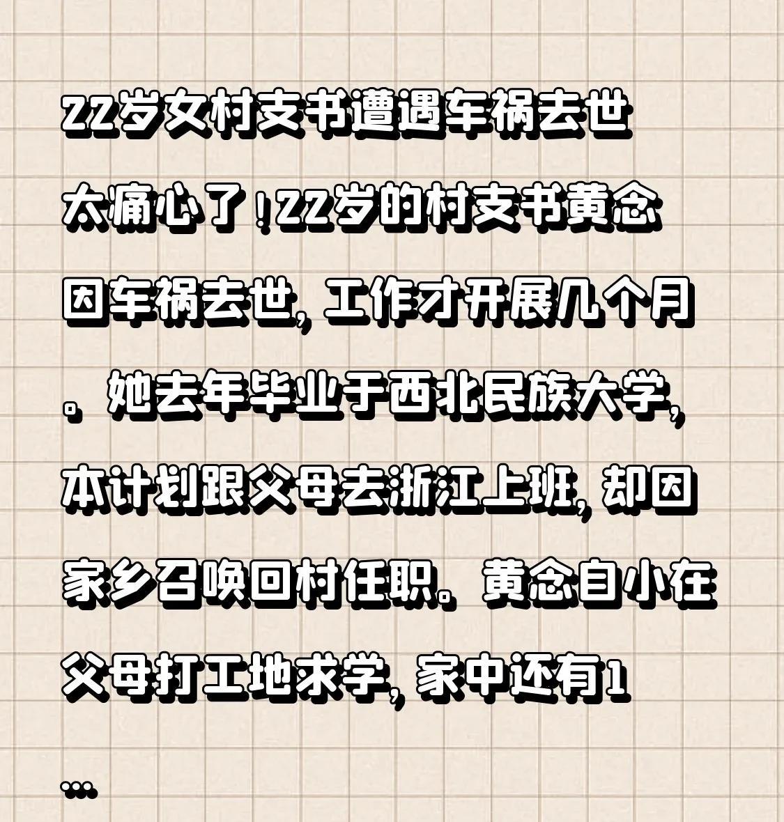 22岁女村支书遭遇车祸去世 22岁的女村支书遭遇车祸离世,真的是太令人痛心了啊!22岁的黄念,身为村支书,才开展工作几个月就因为车祸去世了。她于去年从西北民族大学毕业,原本打算跟着父母到浙江去工作的,可是由于家乡的召唤,她毅然回到村子里任职。 黄念从小就在父母打工的地方求学,家里还有一个14岁的弟弟。8月22日11时左右,在回村的途中,她骑着摩托车与一辆轿车发生了碰撞,送到医院抢救之后,还是没能挽回生命。有见过她的网友说,她特别有礼貌,而且总是面带微笑。这样一位年轻、善良又充满奉献精神的女孩,生命却突然停止了,真希望她在天堂能够安息,也盼望大家每次出行都平平安安的。 #女村官车祸案# #女村官遇害# #村官遇车祸#