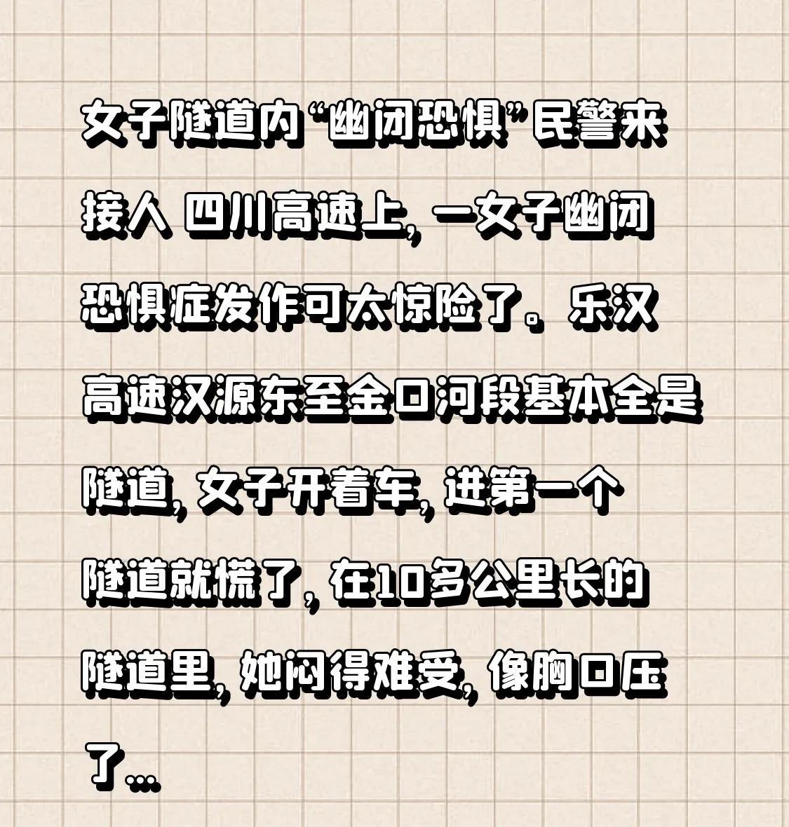女子隧道内“幽闭恐惧”民警来接人 在四川的高速路上,发生了一件惊险万分的事儿。有一名女子,她患有幽闭恐惧症呢。乐汉高速汉源东至金口河段啊,基本上到处都是隧道。 这女子开着车,刚一进入第一个隧道,恐惧就一下子攫住了她。那可是长达10多公里的隧道啊,在里面,她感觉难受极了,就好像有一块大石头沉甸甸地压在胸口,手心也全是汗水。实在没办法,她只好把车停在应急停车带,还打开了双闪。可更危险的是,她和同伴竟然“弃车”,就在隧道路肩上行走起来。 民警接到报警之后,赶忙行动起来。他们一边温柔地安抚女子,一边迅速地调看监控来定位女子的位置,同时通知距离最近的警组前去救助。最后啊,女子被安全地带着离开了,她的车呢,也由民警帮忙“代驾”驶离了隧道。 这件事发生之后啊,大家都议论纷纷。有人感叹说,幽闭恐惧症患者开长隧道可真是太遭罪了。还有人提出了一个很不错的建议呢,说高速隧道群应该多设置一些应急服务,像紧急呼叫按钮或者安慰提示之类的,要是真能这样的话,以后再遇到类似的情况,就能够更加安全啦。 #公路恐惧症# #女生开车恐惧症# #行车恐惧症#