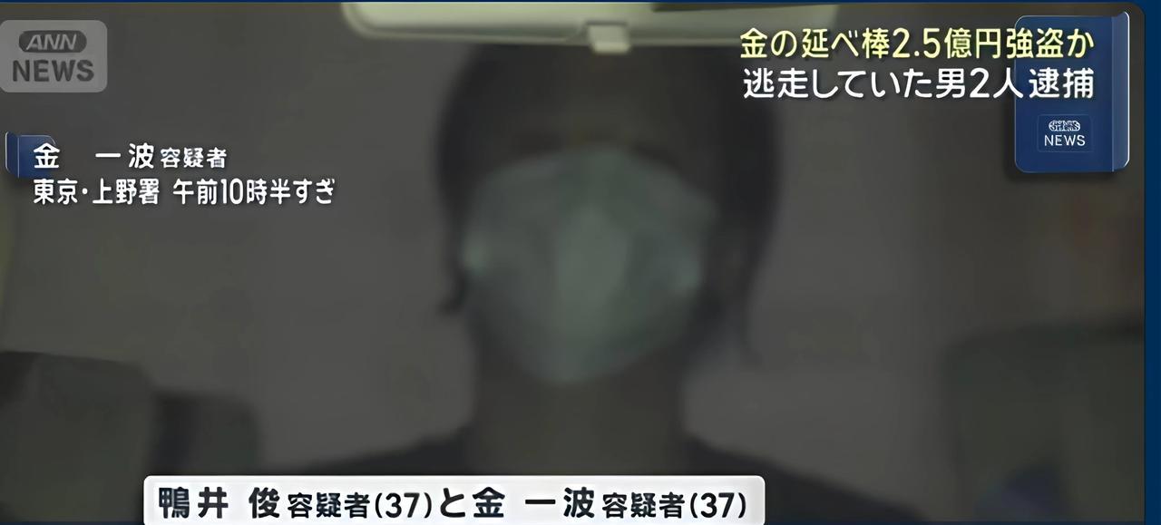 东京街头黄金劫案涉中日两国劫匪 据日本《时事通信社》、《朝日新闻》8月28日报道,日本东京警视厅调查一科以涉嫌抢劫伤人罪再次逮捕了中国籍嫌疑人金一波(37岁)、和日本人鴨井俊(37岁)。 据调查人员称,4月10日上午10时25分左右,两人在东京上野一家金店袭击了一名60多岁男子,并试图抢走两个装有16根金条的手提袋(总市值约2.5亿日元/约1200万人民币)。 当天,受害男子在附近做金条纯度和密度的鉴定,然后准备前往金店出售。 受害人刚下车,立即遭到了骑摩托车接近他的两名嫌疑人喷射催泪瓦斯袭击。 由于受害人强烈反抗,两名嫌疑人没有得逞,随后骑摩托车逃逸。 受害男子双腿和胸部瘀伤入院2周。嫌疑人与受害人不认识。 据说金一波负责策划实施,鴨井俊负责驾驶摩托车。两人分别于6月和 8 月因违反《兴奋剂控制法》而被起诉,因金条劫案再次被捕。