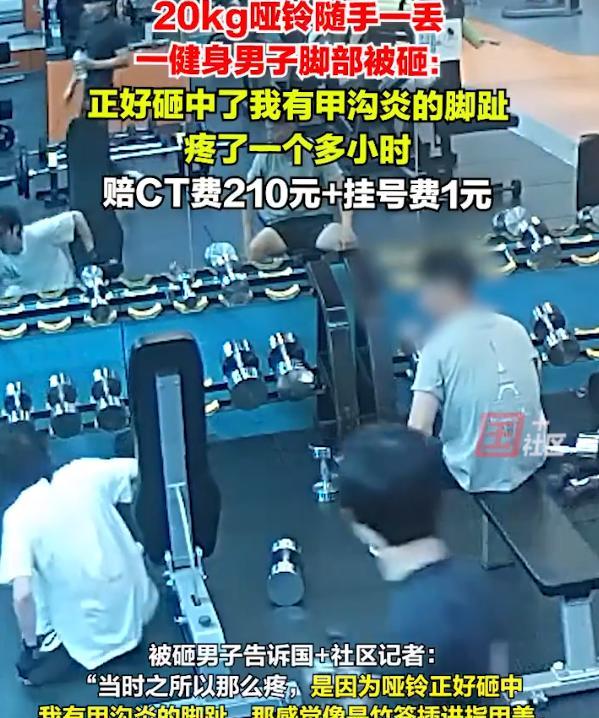 这看着都疼!浙江义乌,一男子在健身馆力量区训练,谁知旁边健身的人随手把哑铃扔在地上,刚好砸中了他有甲沟炎的那只脚上,瞬间疼到不行,最后让对方赔偿了拍CT的210元和挂号费1元。网友:只有得过甲沟炎的人才知道有多疼 监控显示,当时男子正用哑铃做着无氧训练,刚憋了一口气,结果旁边的男子练完后随手就把20kg哑铃一丢,哑铃砸到地面弹了一下,不偏不倚,正好砸在男子的脚上 巧的是,这只脚本来就有甲沟炎,平时轻轻碰一下都钻心地疼,更别说被一个几十斤的铁疙瘩砸中 监控里看得清清楚楚,大哥表情瞬间就变了,整张脸涨得通红。但他接下来的举动,让不少网友感慨“这素质,对比太明显” 他强忍着剧痛,不但没有顺手把哑铃扔开,反而轻轻把它放稳到地上,然后才抱起自己的脚,疼得直不起腰 被砸男子表示,那一砸之后整整疼了一个多小时。两人之前并不认识,对方也没注意到他在旁边。事后他们一起去医院做了检查,CT拍了、号挂了,幸好骨头没事,最后对方赔了211块钱,其中210是CT费,1块是挂号费 说实话,在健身房里,这种“随手一放”的现象并不少见。有些人觉得自己练完了,器械一丢就了事,却没考虑到身边其他人的安全。哑铃、杠铃片这些重物,哪怕只是从几厘米的高度落下,都可能因为弹跳、滚动造成误伤 反观这位被砸的男子,疼成那样还能保持冷静、把器械放稳,确实让人佩服。不是每个人在极度疼痛时还能顾得上这些的,只能说对比之下,两人的差距就显现出来了
