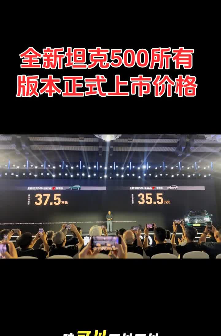 全新坦克500所有版本正式上市价格。 公布价格了,全新坦克500今天正式上市。Hi42智享版带智能辅助驾驶的,37.5万元。这是带智能辅助驾驶版本的,建议零售价33.5万元。全新坦克500T和老款车的价格是一样的,建议零售价35.5万元。这是3.0TV6了,开启越野新时代。谢谢大家。