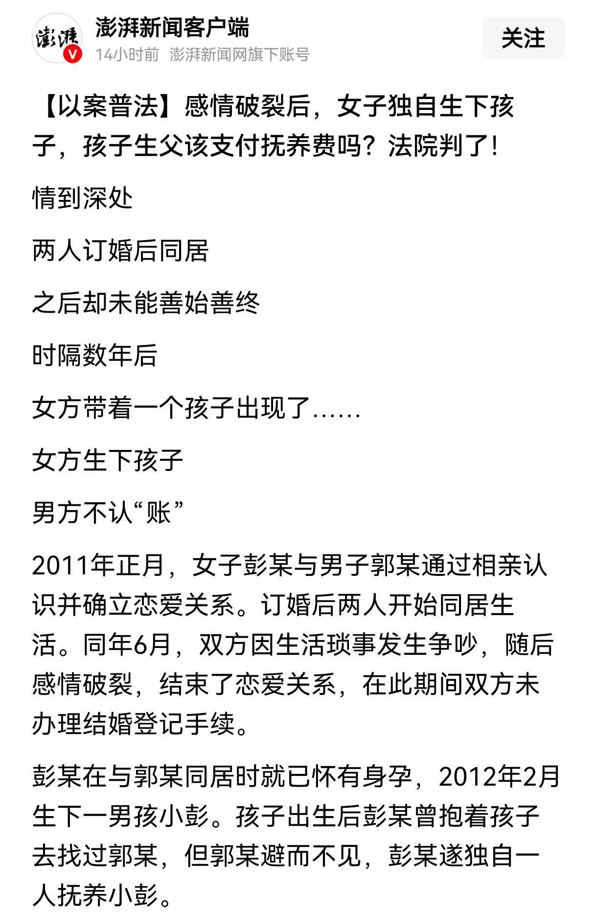 湖南娄底,男子和女子分手8个月后,前女友抱着孩子找上门来,让男子给抚养费,可男子却说孩子不是自己的,对女子母子避而不见,女子只好独自抚养孩子。多年后,孩子长大,费用增多,女子将男子告上法院,法院判决男子支付前9年的抚养费64800元,以后每年按照7200元支付抚养费,直到孩子成年。可男子不服,认为前面9年的费用自己不用给,只要以后每年给7200就行,可法院给出了不同看法。 澎湃新闻8月28日报道了一起女子生下前男友的孩子,要求孩子父亲支付抚养费的案例。 2012年2月,彭女士抱着刚生下不久的孩子,找到前男友郭先生家,说她生下了两人的孩子,是个男孩,她希望跟郭先生一起抚养这个孩子。 可郭先生却认为两人的感情早已经破裂了,已经回不到过去了,让彭女士不要再来打扰自己的新生活。 彭女士很是失望,如果时间能够回到1年多前,她宁愿自己从来都没有遇到过对方。 2011年正月,两人通过相亲认识,初见面时,郭先生对彭女士的印象很好,两人很快就确定了恋爱关系。 之后两人很快订婚,并开始同居生活,可两人仅仅在一起5、6个月,就频频发生争吵,感情破裂。 2011年6月,两人发生激烈争吵后,彭女士从郭先生家搬走,两人结束掉了这段感情。 分手后,郭先生认为自己和彭女士从此再无瓜葛,两人好聚好散,可没想到对方却抱着一个孩子找到了自己家。 并且他发现孩子出生证父亲一栏里的名字,跟自己差了一个字。 他认为自己和彭女士曾经有过一段感情,彭女士不至于会把自己的名字搞错,他更加认为这个孩子不是自己的,自己不想喜当爹,做这个冤大头。 尽管彭女士解释:自己一个人在医院生孩子时,身体虚弱,医生问孩子父亲名字时,自己声音小,医生听错,写错了一个字,自己发现后,打算改回来,可已经入档,改不了了。 可郭先生对彭女士母子依旧避而不见,并拒绝给抚养费,彭女士只能有苦自己咽,独自抚养孩子。 可随着孩子的长大,教育、医疗等费用增加,彭女士有些力不从心,她再次想起了郭先生,觉得郭先生应该尽到做父亲的责任,即使不抚养孩子,也应当支付相应的费用。 2021年8月,她再次联系郭先生,就孩子抚养费的事情跟他商量,可郭先生依旧认为孩子不是自己的,拒绝支付抚养费。 彭女士一气之下,将郭先生告上了法庭,她提供了证据,证明孩子跟郭先生之间可能存在亲子关系,并向法院申请做亲子鉴定。 1、彭女士主张孩子是郭先生的,请求确认郭先生和孩子的亲子关系。 《民法典》第1073条规定:对亲子关系有异议且有正当理由的父或母,或成年子女,可向人民法院提起诉讼,请求确认或否认亲子关系。 彭女士认为郭先生不愿意支付抚养费,是因为担心孩子不是他的,但是他们父子可以做亲子鉴定。 一开始郭先生说什么都不肯配合,后经多次沟通,他终于松口,和孩子做了亲子鉴定。 结果显示为:郭先生是孩子的生物学父亲。 2、郭先生作为孩子父亲,没有直接抚养孩子,需要支付抚养费。 郭先生系孩子生父,可这么多年,他对孩子并未尽到抚养、教育和保护的义务,也没有直接抚养过孩子。 不直接抚养孩子的生父或者生母,需要支付孩子的抚养费。 抚养费的数额,可根据子女的实际需要、父母双方的负担能力和当地的实际生活水平确定。 最终,法院判决郭先生支付孩子2021年2月21日到2021年2月20日的抚养费64800元,自2021年2月21日起,每年2月23日向彭女士支付下一年度的抚养费7200元,直到孩子成年。 3、郭先生不愿意支付之前的64800元,只肯承担以后每年7200元的抚养费,可法院却驳回了他的上诉。 一审判决下来后,郭先生不服,认为2021年前的抚养费因彭女士没有起诉,自己可以不给,他只要按照以后每年给7200元的抚养费就可以了,他提起了上诉。 《民法典》第1067条规定:父母不履行抚养义务的,未成年子女或者不能独立生活的成年子女,有要求父母给付抚养费的权利。 父母对未成年子女的抚养义务是“自子女出生时产生,至子女成年时终止”的强制性规定。 孩子出生后,郭先生和彭女士没有办理结婚登记,郭先生否认亲子关系,拒绝抚养孩子,可彭女士起诉后,经鉴定郭先生系孩子生父。 在这种情况下,郭先生需补缴孩子出生至今的所有抚养费,包括奶粉钱、幼儿园学费、生病住院费等。 最终,法院驳回了郭先生的诉求,维持了原判。 关注@律觀法说 ,从法律角度看世界,感受不一样的人情冷暖。