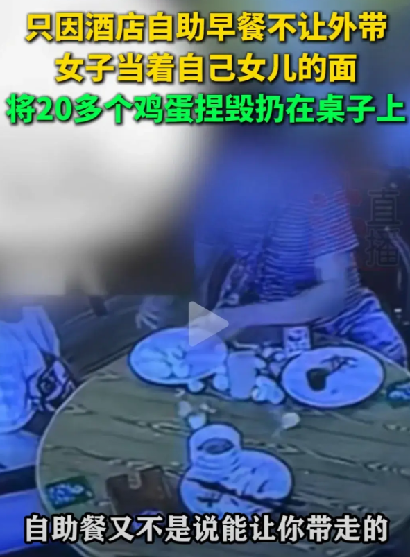 “这是有多蠢呐”,陕西,一女子带孩子吃酒店自助早餐,因服务员不同意外带,便当着孩子的面,将20个鸡蛋播开,捏碎了丢在桌子上扬长而去。