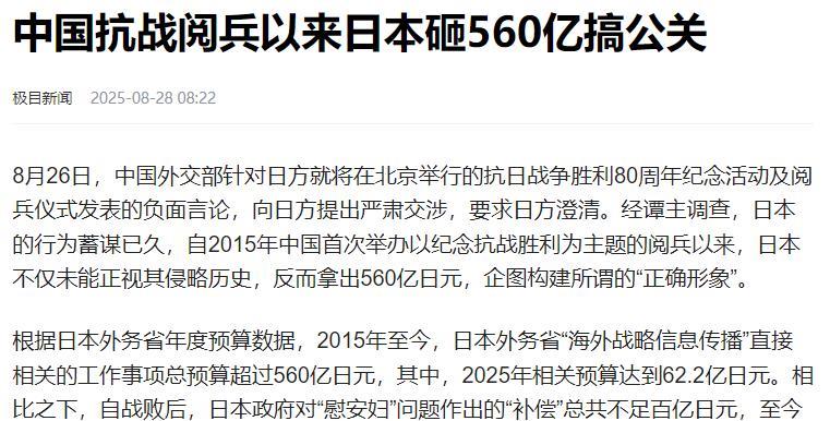 难怪总有人替小日子摇旗,玉渊潭天公布真相,日本撒560亿买“狗粮”。 就在8月26号,咱们外交部专门找日方交涉,起因是日本对着北京要办的抗日战争胜利80周年纪念活动和阅兵仪式说了些负面言论,咱们肯定得让他们说清楚,到底想搞什么名堂。 可谁能料到,日本这么做根本不是一时兴起,早从好几年前就开始盘算着了。据玉渊谭天查出来的情况,2015年咱们中国第一次办纪念抗战胜利的阅兵时,日本就没打算好好面对自己当年侵略的历史,反倒偷偷拿出一大笔钱,想把自己包装成“形象挺好”的样子。 从日本外务省公布的年度预算能看明白,2015年到现在,花在“海外战略信息传播”上的钱加起来已经超过560亿日元了,光2025年这一年,就准备拿62.2亿日元干这事。这么多钱,没用来弥补当年造的孽,反倒花在这种歪门邪道上。 日本专门用这些钱拉拢外国人,让这些人帮着说日本的好话,甚至还想改海外教科书里关于“慰安妇”的内容,想把自己当年干的坏事偷偷抹掉。 日本有个叫“国际交流基金会”的机构,之前就被人扒出来过,年年都给钱资助外国的学者、媒体人,让他们传播偏向日本的内容,说白了就是想搅乱大家对历史的正确认识。 这也就能解释,为啥平时总有人没头没脑地帮日本说话,说不定这些人就是拿了日本给的“好处”,帮着日本混淆是非呢。 可再看看日本对真正该补偿的人做了啥?当年受“慰安妇”问题伤害的那些人,日本给的“补偿”到现在都没超过百亿日元,既没好好给受害者道歉,也没做出像样的赔偿。 一边舍不得给受害者弥补,一边又大方地花钱给自己“装好人”,这心思也太明显了。 更过分的是,现在日本还通过外交渠道,去劝欧洲和亚洲的一些国家,让他们别轻易来参加北京的“九三”纪念活动。 针对这事,咱们国防部新闻发言人也说得很实在:日本想靠掩盖历史、推卸责任来“洗白”自己,根本没用,只会让全世界爱好和平的人更警惕,也更看不起他们。 日本要是真有诚意,就该好好面对当年的侵略历史,彻底跟军国主义划清界限,这样才能让亚洲邻国和国际社会真正信任它。 所以大家可得把眼睛擦亮点,看清楚日本这些小动作的真面目,别被他们花的钱、说的漂亮话骗了,可不能稀里糊涂帮着他们歪曲历史,到头来成了他们的“帮凶”。