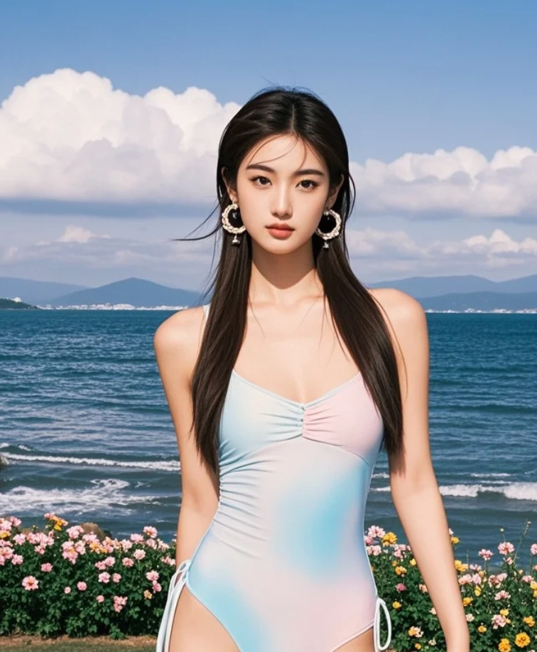 海浪轻拍岸边,应和着她内心的宁静节拍