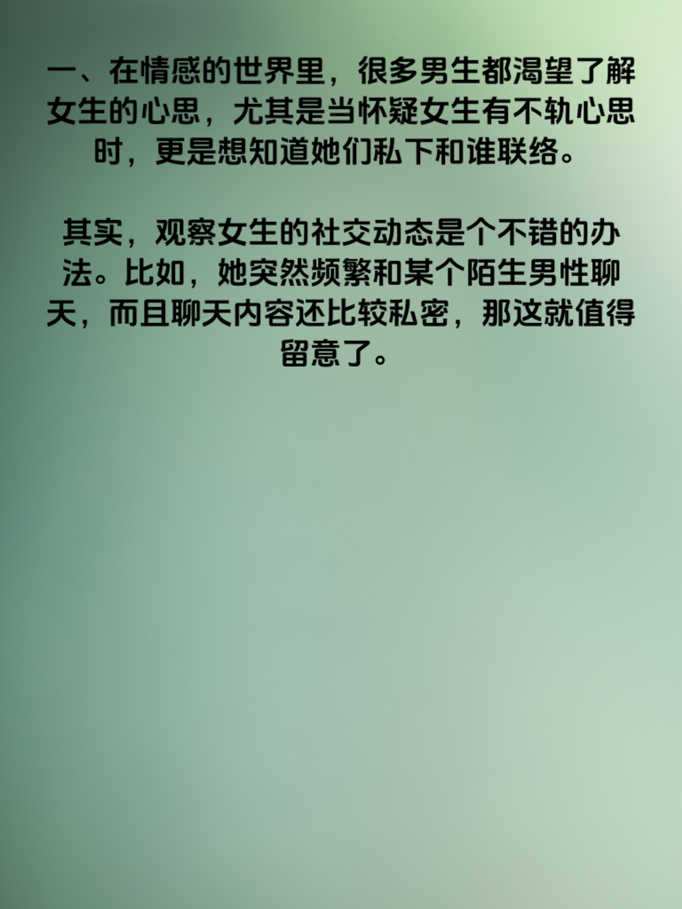 一、在情感的世界里,很多男生都渴望了解女生的心思,尤其是当怀疑女生有不轨心思时,更是想知道她们私下和谁联络。其实,观察女生的社交动态是个不错的办法。比如,她突然频繁和某个陌生男性聊天,而且聊天内容还比较私密,那这就值得留意了。 二、还有,如果她总是背着你接电话,或者接完电话后神色慌张,对通话内容遮遮掩掩,那很可能电话那头的人有着特殊意义。另外,社交软件上的互动也能透露不少信息。要是她新添加了一些可疑的账号,并且互动频繁,那就要小心了。 三、但要注意,不能仅凭这些就断定她有不轨心思。也许她只是在和普通朋友交流工作、爱好等。所以,男生们发现这些情况后,不要急于质问,而是找个合适时机,平和地沟通,表达你的关心和疑惑,看她如何回应,这样才能更好地了解真相,避免因误会而破坏感情。