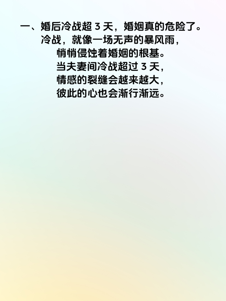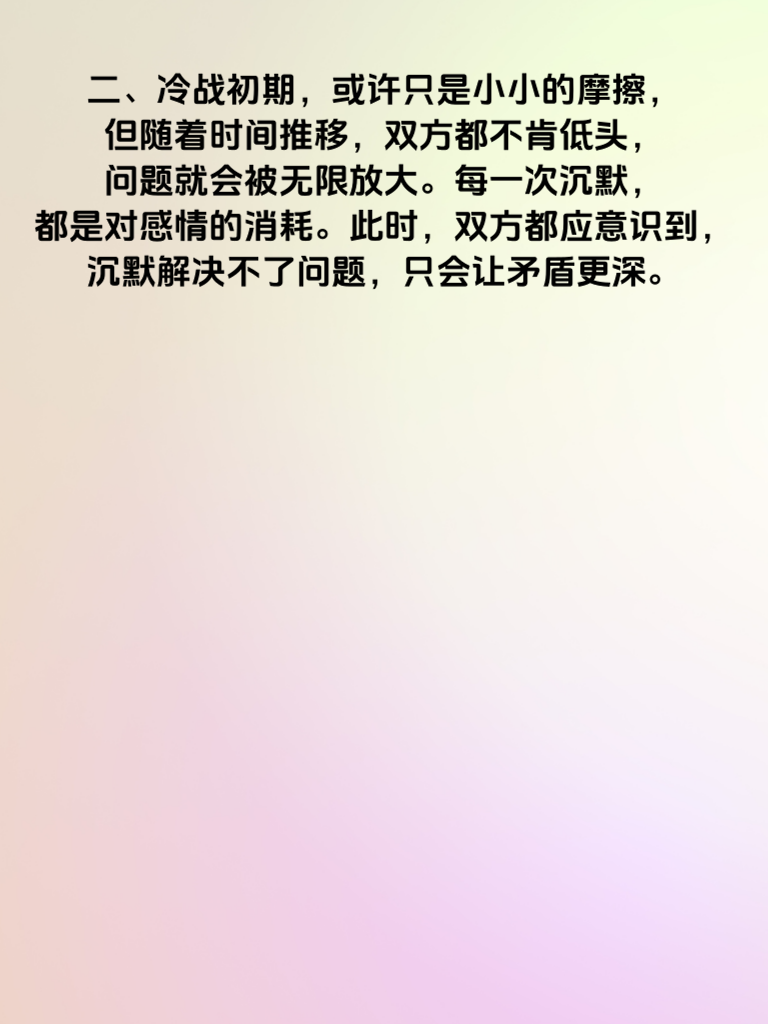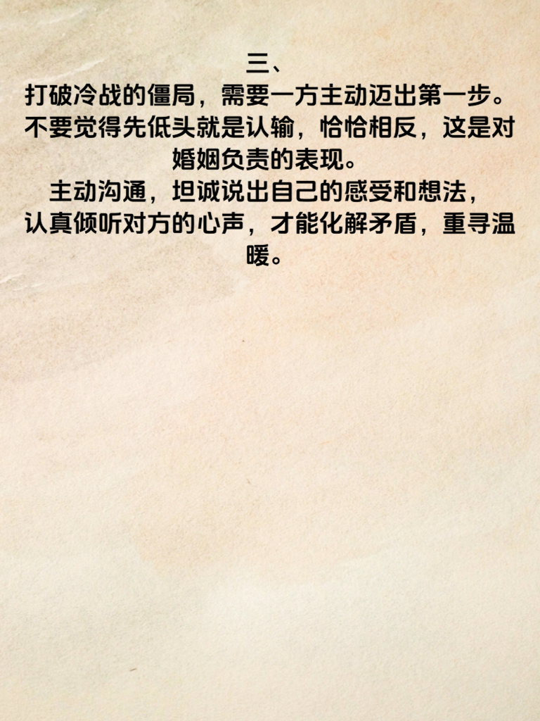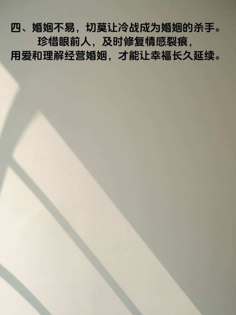 一、婚后冷战超3天,婚姻真的危险了。冷战,就像一场无声的暴风雨,悄悄侵蚀着婚姻的根基。当夫妻间冷战超过3天,情感的裂缝会越来越大,彼此的心也会渐行渐远。 二、冷战初期,或许只是小小的摩擦,但随着时间推移,双方都不肯低头,问题就会被无限放大。每一次沉默,都是对感情的消耗。此时,双方都应意识到,沉默解决不了问题,只会让矛盾更深。 三、打破冷战的僵局,需要一方主动迈出第一步。不要觉得先低头就是认输,恰恰相反,这是对婚姻负责的表现。主动沟通,坦诚说出自己的感受和想法,认真倾听对方的心声,才能化解矛盾,重寻温暖。 四、婚姻不易,切莫让冷战成为婚姻的杀手。珍惜眼前人,及时修复情感裂痕,用爱和理解经营婚姻,才能让幸福长久延续。