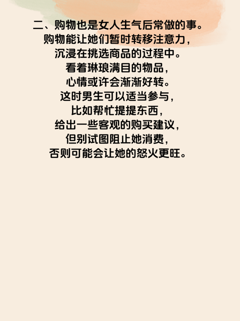一、女人生气后,常常会选择沉默。她们不是不想说话,而是在气头上,每一个字都可能带着刺。此时,男生千万别以为沉默是默认,这恰恰是她们在压抑情绪。给她一些时间和空间,让她能冷静下来梳理思绪,等她愿意开口时,再耐心倾听,不要急于辩解,用理解和包容去化解她的怒火。 二、购物也是女人生气后常做的事。购物能让她们暂时转移注意力,沉浸在挑选商品的过程中。看着琳琅满目的物品,心情或许会渐渐好转。这时男生可以适当参与,比如帮忙提提东西,给出一些客观的购买建议,但别试图阻止她消费,否则可能会让她的怒火更旺。 三、女人生气后还可能会找闺蜜倾诉。闺蜜是她们情感的避风港,会在这时给予安慰和支持。男生要明白,这是她释放情绪的正常方式,不要因此吃醋或阻拦。等她倾诉完,再以温和的态度和她沟通,表达你的关心和在乎,让她知道你一直在她身边。