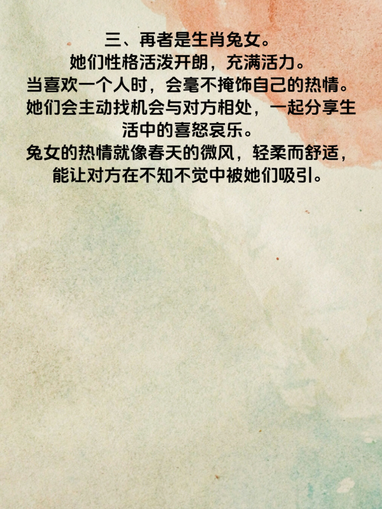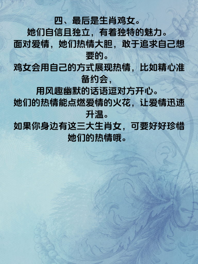 一、在爱情的舞台上,有些生肖女天生就带着满满的热情,倒追指数爆表。其中,有三大生肖女格外引人注目。 二、首先是生肖羊女。她们内心温柔且细腻,情感丰富。一旦遇到心仪之人,那股热情便如潮水般汹涌。她们会主动关心对方的生活点滴,用贴心的话语温暖对方。羊女的热情很纯粹,不掺杂任何杂质,她们会勇敢地表达自己的心意,让对方感受到她们深深的爱意。 三、再者是生肖兔女。她们性格活泼开朗,充满活力。当喜欢一个人时,会毫不掩饰自己的热情。她们会主动找机会与对方相处,一起分享生活中的喜怒哀乐。兔女的热情就像春天的微风,轻柔而舒适,能让对方在不知不觉中被她们吸引。 四、最后是生肖鸡女。她们自信且独立,有着独特的魅力。面对爱情,她们热情大胆,敢于追求自己想要的。鸡女会用自己的方式展现热情,比如精心准备约会,用风趣幽默的话语逗对方开心。她们的热情能点燃爱情的火花,让爱情迅速升温。如果你身边有这三大生肖女,可要好好珍惜她们的热情哦。