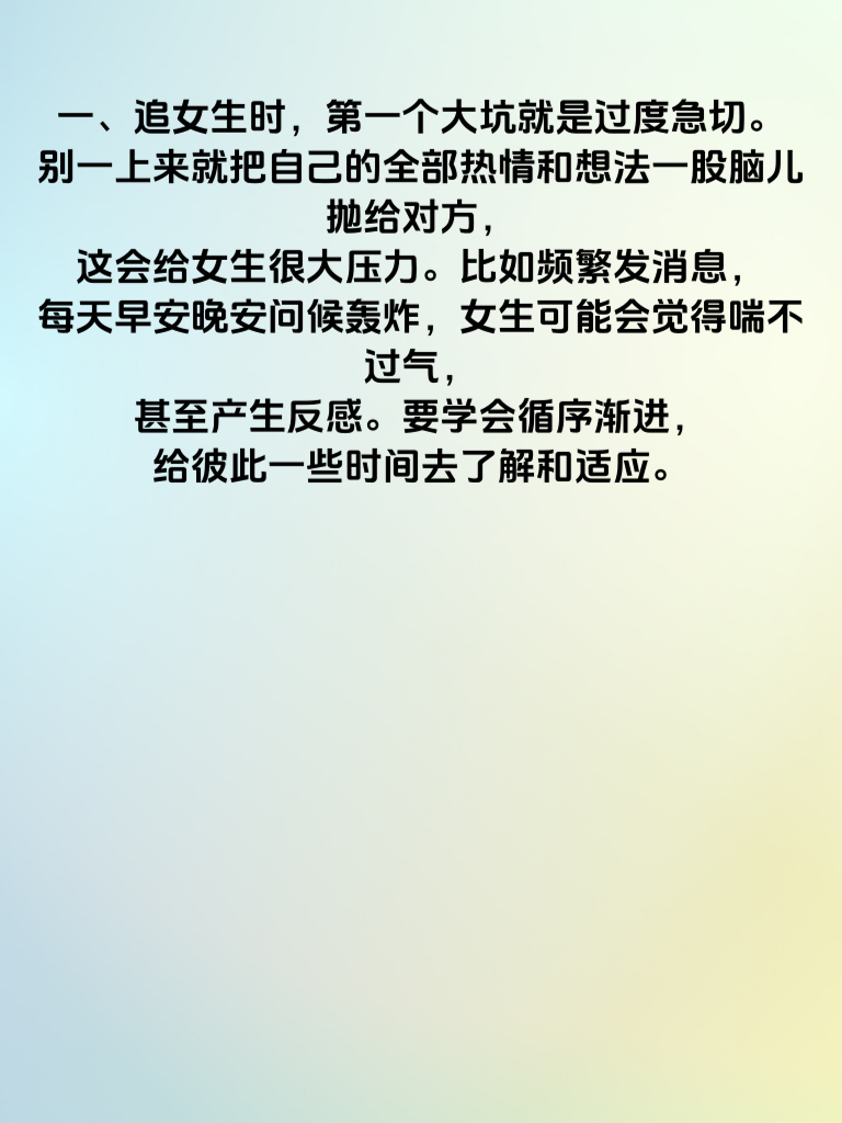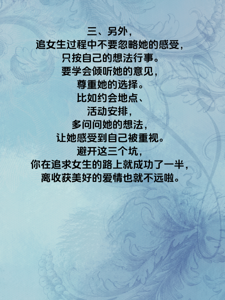 一、追女生时,第一个大坑就是过度急切。别一上来就把自己的全部热情和想法一股脑儿抛给对方,这会给女生很大压力。比如频繁发消息,每天早安晚安问候轰炸,女生可能会觉得喘不过气,甚至产生反感。要学会循序渐进,给彼此一些时间去了解和适应。 二、还有,千万别在女生面前过度吹嘘自己。有些男生为了吸引女生注意,夸大自己的成就、能力,可一旦被识破,形象就会大打折扣。真诚才是必杀技,实实在在地展现自己的优点和真实的生活,让女生看到真实的你,她才更有可能对你倾心。 三、另外,追女生过程中不要忽略她的感受,只按自己的想法行事。要学会倾听她的意见,尊重她的选择。比如约会地点、活动安排,多问问她的想法,让她感受到自己被重视。避开这三个坑,你在追求女生的路上就成功了一半,离收获美好的爱情也就不远啦。