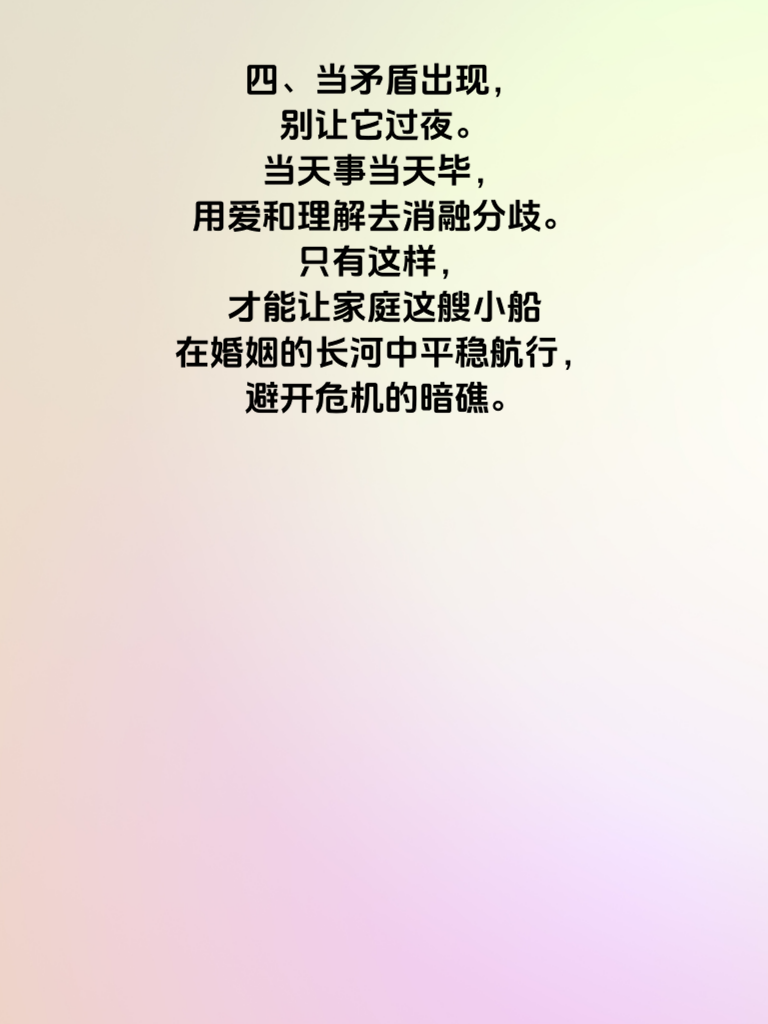 一、婚后矛盾超3天,家庭将面临危机。这绝非危言耸听,而是无数家庭的真实写照。婚后生活,磕磕绊绊在所难免,但矛盾一旦持续超3天,就容易积怨成疾。 二、为何3天是个关键节点?因为此时双方情绪已从最初的冲动归于平静,开始理性审视矛盾。若不能妥善解决,不满就会像滚雪球般越滚越大。 三、那么该如何应对呢?首先,要学会倾听对方。很多时候,矛盾源于误解,耐心倾听能化解大半。其次,及时沟通想法,坦诚表达自己的感受与需求。再者,懂得让步与妥协,家不是战场,无需争个输赢。 四、当矛盾出现,别让它过夜。当天事当天毕,用爱和理解去消融分歧。只有这样,才能让家庭这艘小船在婚姻的长河中平稳航行,避开危机的暗礁。