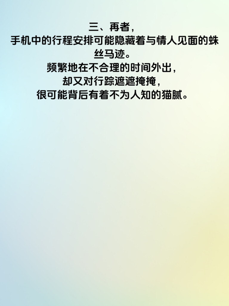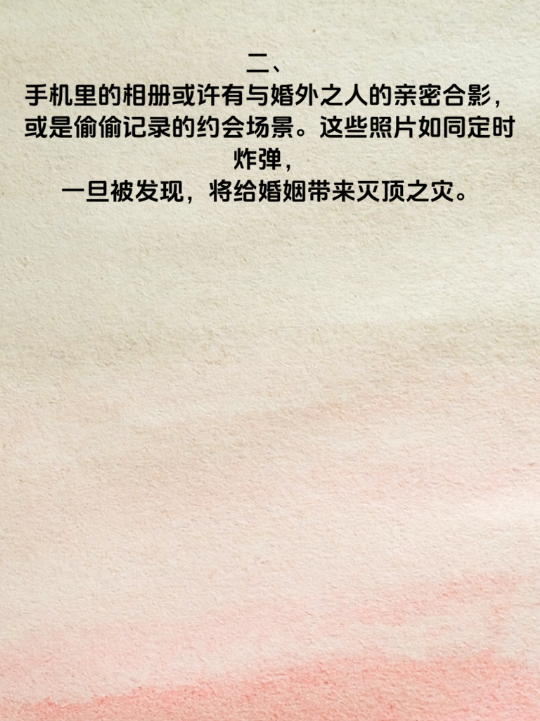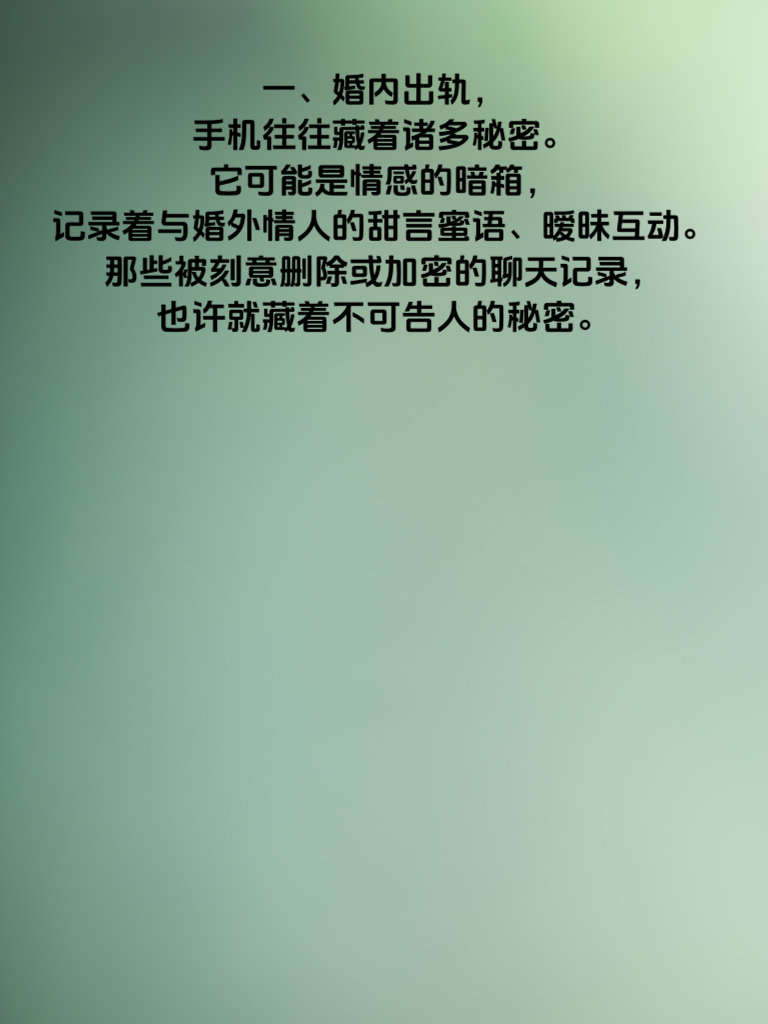 一、婚内出轨,手机往往藏着诸多秘密。它可能是情感的暗箱,记录着与婚外情人的甜言蜜语、暧昧互动。那些被刻意删除或加密的聊天记录,也许就藏着不可告人的秘密。 二、手机里的相册或许有与婚外之人的亲密合影,或是偷偷记录的约会场景。这些照片如同定时炸弹,一旦被发现,将给婚姻带来灭顶之灾。 三、再者,手机中的行程安排可能隐藏着与情人见面的蛛丝马迹。频繁地在不合理的时间外出,却又对行踪遮遮掩掩,很可能背后有着不为人知的猫腻。 四、另外,支付记录也不容忽视。给婚外情人的转账、购买礼物的消费,都可能在不经意间留下痕迹。当婚姻亮起红灯,这些手机里的秘密就可能成为伤害彼此的利刃。所以,想要守护婚姻,不妨多留意对方手机中的这些潜在秘密,及时发现问题,才能更好更好更好更好地维护家庭的完整与幸福。