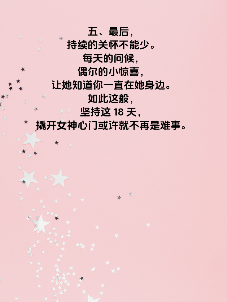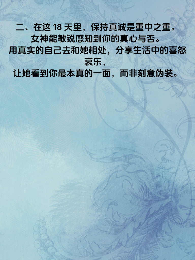 一、追求女神,这18天是关键甜蜜期。首先,要用心去了解她的喜好。从她日常的动态、朋友圈,亦或是不经意的交谈中捕捉线索。比如她喜欢的电影类型、钟爱的美食,这些看似微小的细节,却是打开她心门的钥匙。 二、在这18天里,保持真诚是重中之重。女神能敏锐感知到你的真心与否。用真实的自己去和她相处,分享生活中的喜怒哀乐,让她看到你最本真的一面,而非刻意伪装。 三、制造专属的浪漫瞬间。不需要奢华昂贵,哪怕是一次精心准备的野餐,一场只有你们的星空下漫步。这些独特的时刻,会在她心中留下深刻印记,拉近你们的距离。 四、注意沟通的方式。倾听她的想法,尊重她的观点,用温和且有深度的交流,让她感受到你对她思想的重视。适时给出你的见解,但不要强行灌输。 五、最后,持续的关怀不能少。每天的问候,偶尔的小惊喜,让她知道你一直在她身边。如此这般,坚持这18天,撬开女神心门或许就不再是难事。