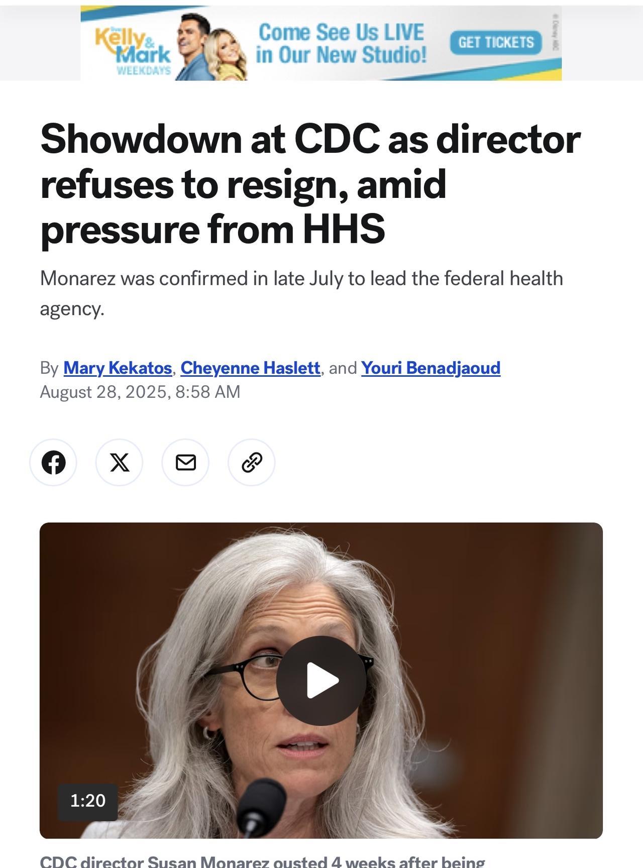 美国卫生与公众服务部称,刚刚宣誓就职的疾病预防控制中心主任苏珊·莫纳雷斯Susan Monarez在获得参议院批准仅四周后就被解雇。 作为回应,疾病控制和预防中心(CDC)律师主任莫纳雷斯Susan Monarez周三晚上表示,她不会辞职,尽管卫生与公众服务部长小肯尼迪Robert F. Kennedy Jr.试图将她开除,因为她没有在“不科学、鲁莽的指令和解雇专门的健康专家”上贴上“橡皮印章”。 “莫纳雷斯博士既没有辞职,也没有收到白宫关于她被解雇的通知,作为一个正直和致力于科学的人,她不会辞职,”律师Mark Zaid和Abbe Lowell在代表Monarez的一份声明中写道。 此前,HHS周三早些时候在X上发布了一份声明,称“Susan Monarez不再是疾病控制和预防中心主任。” 该帐户写道:“我们感谢她为美国人民提供的奉献。” 白宫有权罢免莫纳雷斯,但没有回应就下一步行动发表评论的请求。 最近宣誓就职的疾病控制和预防中心(CDC)主任莫纳雷斯在四周前被参议院确认。 莫纳雷斯Monarez是该职位的第二个提名人,此前特朗普总统的第一位提名人Dave Weldon没有获得参议院确认的选票,部分原因是他对疫苗持怀疑态度的历史。 莫纳雷斯Monarez在确认听证会上明确表示她对疫苗的支持:“我认为疫苗可以拯救生命。我认为我们需要继续支持促进疫苗的利用,”她在7月说。 周三早些时候,肯尼迪的美国食品药品监督管理局缩小了今年秋季和冬季获得更新疫苗的批准范围。 最新的疫苗只批准用于老年人——65岁及以上的成年人——以及年轻人,如果他们至少有一种潜在疾病使他们患严重疾病的风险更高,这偏离了先前的指导,即6个月及以上的每个人都应该接种疫苗。 美国食品药品监督管理局的决定将于本月晚些时候提交给疾控中心,在那里,莫纳雷斯和一个顾问委员会,最近都被肯尼迪精心挑选的选择所取代,将有机会进行权衡——莫纳雷斯最终需要签字。 3月,小肯尼迪还监督了对儿科疫苗接种时间表的更改,转向了“共享临床决策”模式,将为儿童接种新冠肺炎疫苗的决定留给父母,并由医生提供建议。 小肯尼迪为疫苗政策变化辩护,以推进“科学、安全和常识”。 莫纳雷斯Monarez的律师周三表示,她因抵制小肯尼迪Kennedy的改变而成为“目标”。