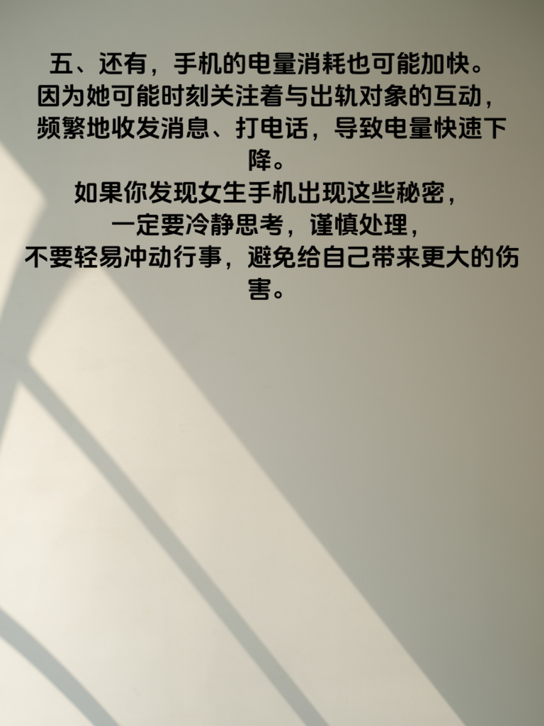 一、在情感的世界里,手机常常藏着许多不为人知的秘密。当女生出现出轨迹象时,手机或许就成了揭开真相的关键。 二、首先,她的手机使用时间可能会变得异常。原本规律的作息,突然频繁在深夜抱着手机,回复信息也变得小心翼翼,生怕被旁人发现。 三、再者,社交软件的消息记录或许会有猫腻。她可能会与某个特定的人聊天频繁,聊天内容也多是背着你进行,甚至会刻意删除一些对话。 四、手机相册也可能暗藏玄机。也许会有一些与他人的亲密合影,或者是只对那个人可见的照片,这些照片她会精心隐藏,不让你轻易察觉。 五、还有,手机的电量消耗也可能加快。因为她可能时刻关注着与出轨对象的互动,频繁地收发消息、打电话,导致电量快速下降。如果你发现女生手机出现这些秘密,一定要冷静思考,谨慎处理,不要轻易冲动行事,避免给自己带来更大的伤害。
