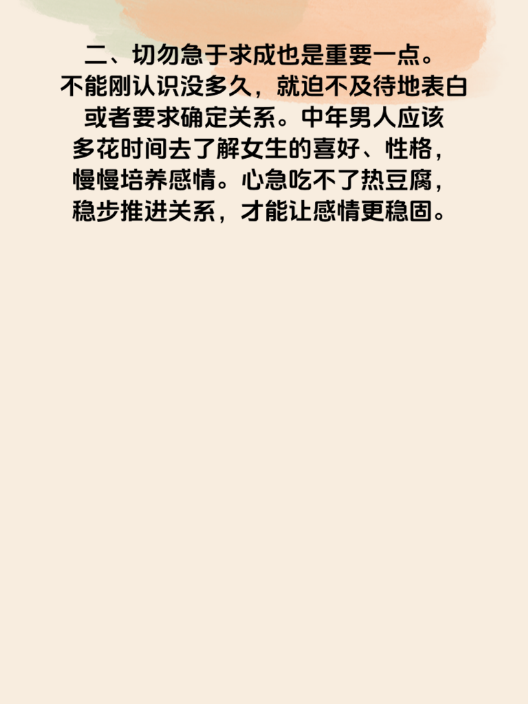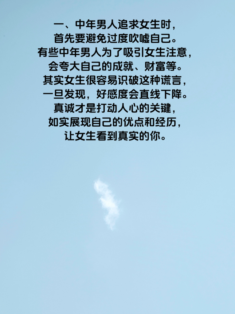一、中年男人追求女生时,首先要避免过度吹嘘自己。有些中年男人为了吸引女生注意,会夸大自己的成就、财富等。其实女生很容易识破这种谎言,一旦发现,好感度会直线下降。真诚才是打动人心的关键,如实展现自己的优点和经历,让女生看到真实的你。 二、切勿急于求成也是重要一点。不能刚认识没多久,就迫不及待地表白或者要求确定关系。中年男人应该多花时间去了解女生的喜好、性格,慢慢培养感情。心急吃不了热豆腐,稳步推进关系,才能让感情更稳固。 三、还有,不要忽略自身形象。中年男人可能觉得自己事业有成,外在就不重要了。但整洁得体的外表能给女生留下好印象。保持良好的体态,穿着适合自己的服装,打理好头发,展现出积极向上的生活态度,这会大大增加你的吸引力。总之,避开这些陷阱,中年男人追求女生才能更顺利。