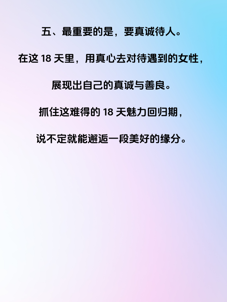 一、你知道吗?中年男性有着独特的魅力回归期,而这个期限仅有18天。在这宝贵的18天里,是他们展现自我,吸引心仪女性的关键时段。 二、首先,形象塑造很重要。这18天里,注重仪表,保持整洁得体的着装,打理好头发,展现出成熟稳重又不失活力的形象。 三、再者,提升内在修养。利用这段时间,多读书、学习新知识,让自己在交流中更有内涵,能说出有深度的见解。 四、社交方面也别错过。积极参与一些有意义的社交活动,扩大自己的社交圈,增加与女性接触的机会。 五、最重要的是,要真诚待人。在这18天里,用真心去对待遇到的女性,展现出自己的真诚与善良。抓住这难得的18天魅力回归期,说不定就能邂逅一段美好的缘分。