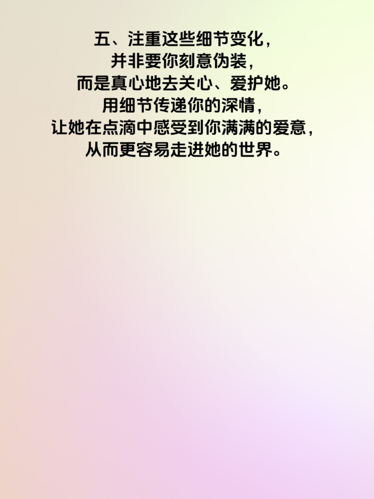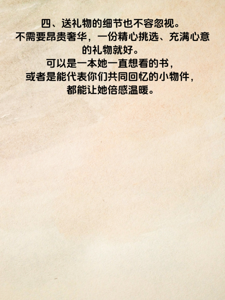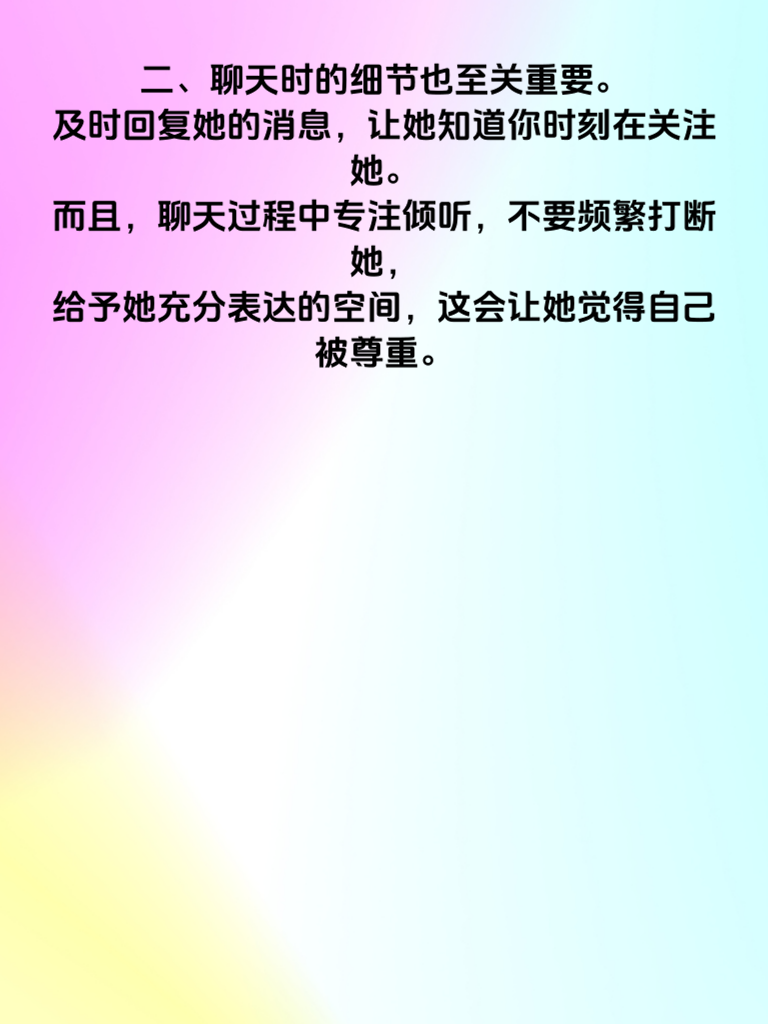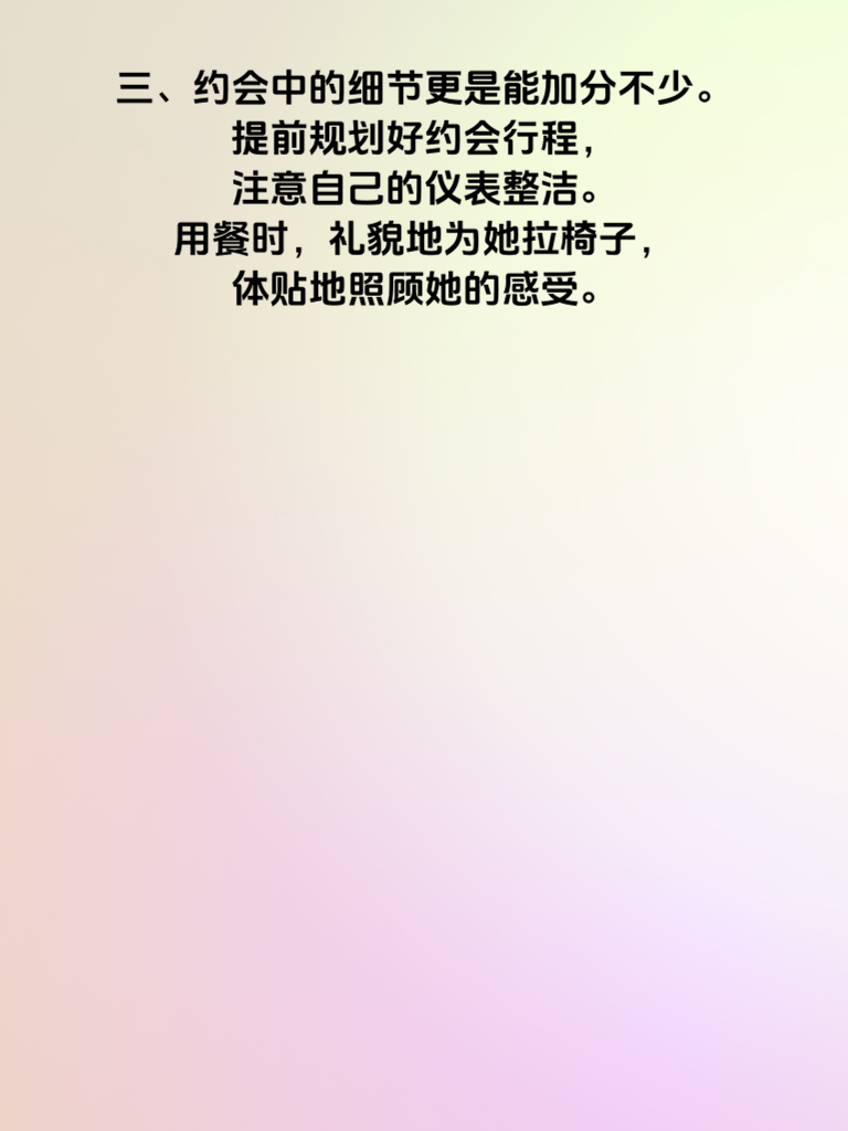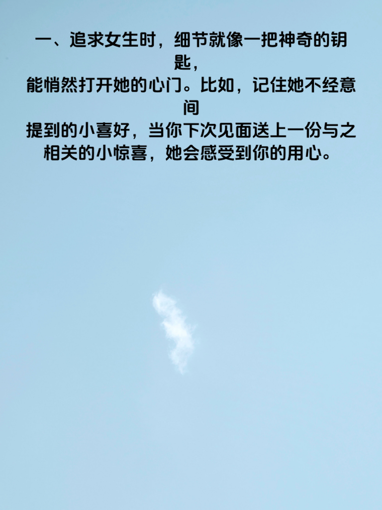 一、追求女生时,细节就像一把神奇的钥匙,能悄然打开她的心门。比如,记住她不经意间提到的小喜好,当你下次见面送上一份与之相关的小惊喜,她会感受到你的用心。 二、聊天时的细节也至关重要。及时回复她的消息,让她知道你时刻在关注她。而且,聊天过程中专注倾听,不要频繁打断她,给予她充分表达的空间,这会让她觉得自己被尊重。 三、约会中的细节更是能加分不少。提前规划好约会行程,注意自己的仪表整洁。用餐时,礼貌地为她拉椅子,体贴地照顾她的感受。 四、送礼物的细节也不容忽视。不需要昂贵奢华,一份精心挑选、充满心意的礼物就好。可以是一本她一直想看的书,或者是能代表你们共同回忆的小物件,都能让她倍感温暖。 五、注重这些细节变化,并非要你刻意伪装,而是真心地去关心、爱护她。用细节传递你的深情,让她在点滴中感受到你满满的爱意,从而更容易走进她的世界。