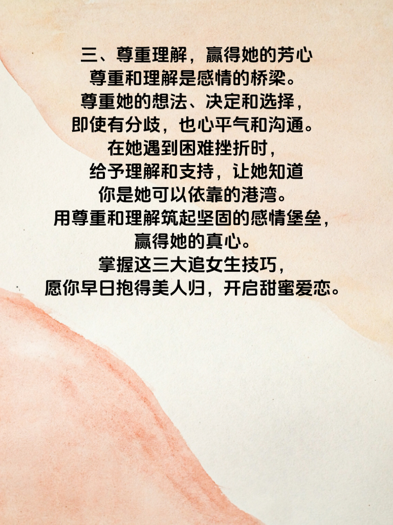 一、真心陪伴,走进她的世界 在追求女生的路上,真心陪伴是基石。了解她的喜好,陪她做喜欢的事。若她爱看书,就陪她泡图书馆;若她爱运动,那就一起挥洒汗水。用时间和行动让她感受到你的在乎,走进她的生活,成为她生活中温暖且重要的存在。 二、适时赞美,点亮她的自信 每个女生都渴望被赞美。留意她的闪光点,无论是漂亮的穿搭、出色的工作表现还是善良的举动,都要不吝赞美。真诚的夸赞能让她心情愉悦,自信心爆棚。但赞美要恰到好处,发自内心,这样她才会相信你是真的欣赏她。 三、尊重理解,赢得她的芳心 尊重和理解是感情的桥梁。尊重她的想法、决定和选择,即使有分歧,也心平气和沟通。在她遇到困难挫折时,给予理解和支持,让她知道你是她可以依靠的港湾。用尊重和理解筑起坚固的感情堡垒,赢得她的真心。掌握这三大追女生技巧,愿你早日抱得美人归,开启甜蜜爱恋。