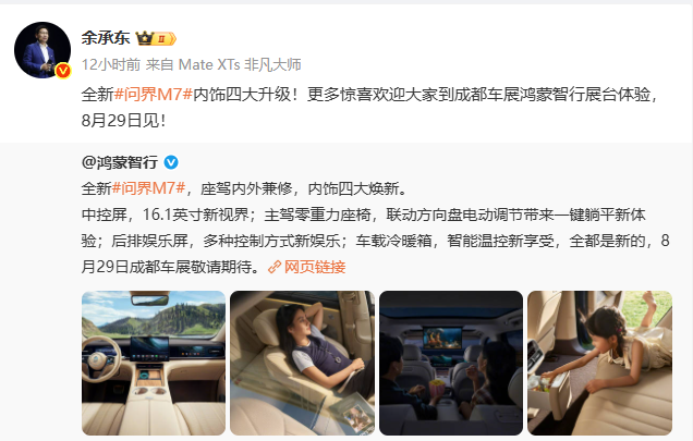 余承东: 新问界M7,里面有四个升级,明天成都车展见!