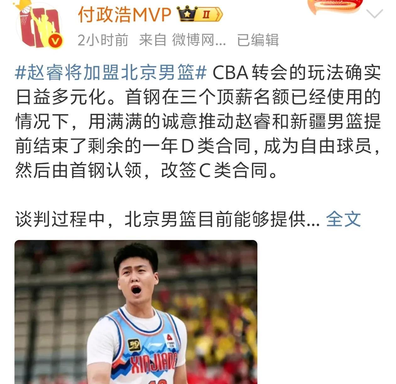 赵睿如愿以偿! 北汽神操作,球迷直呼大结局。 据媒体人透露:首钢与新疆达成意向,提前买断赵睿合同,成为自由球员后和北汽签下C类三年合同。 张云松这波操作不亚于朱芳雨5换2啊!直接弄来了中国男篮国家队长,随着赵睿的加盟北汽实力更上一层。赵睿与周琦重组国家后场与内线核心,北汽新赛季的目标一一只有夺冠。
