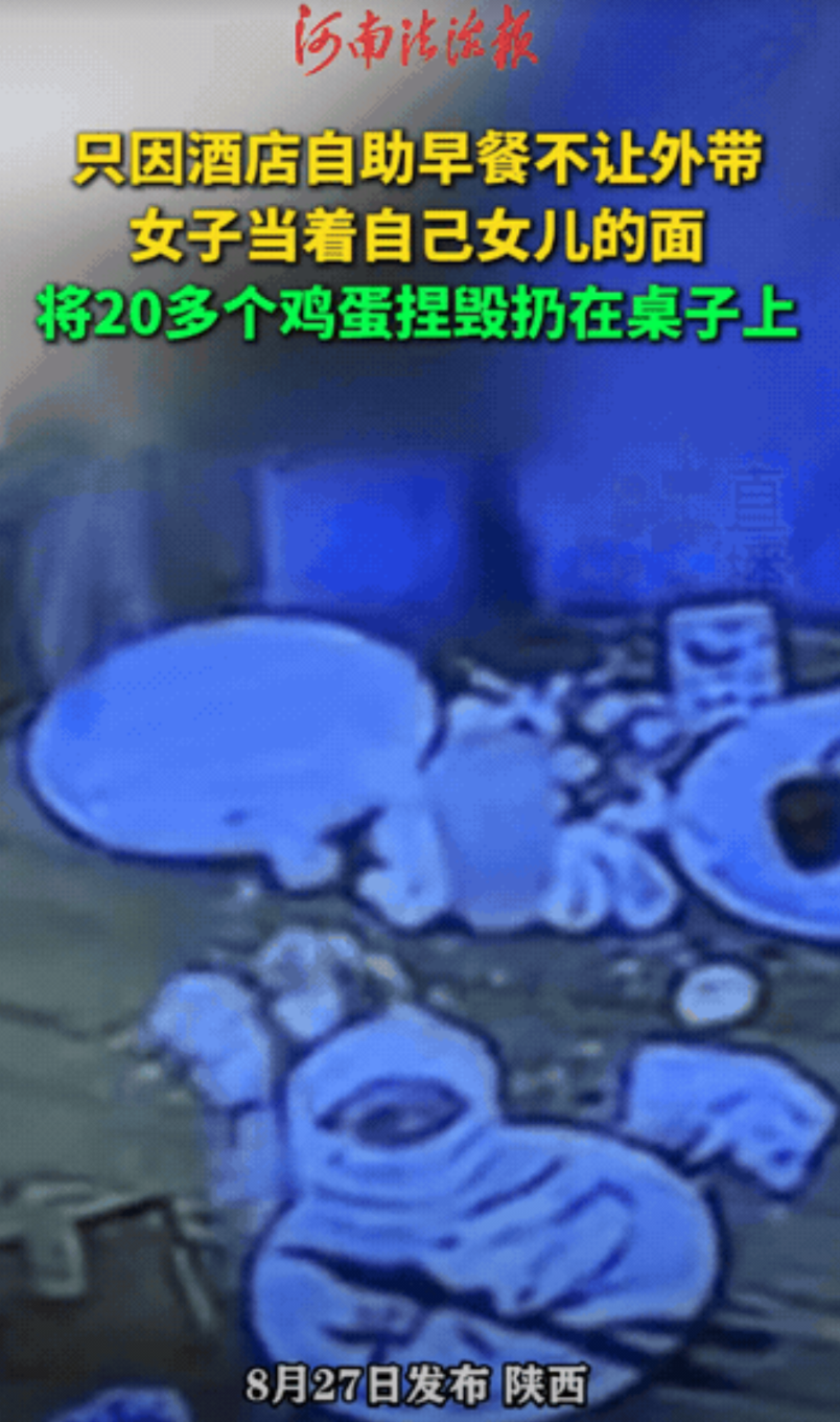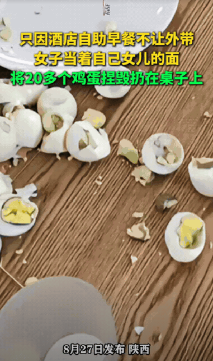 “太坏了!”陕西,女子觉得酒店的自助早餐好吃,打包二十多个鸡蛋想带走,服务员没同意,女子来脾气了,当着大家面把鸡蛋全都磕碎了,搞的桌子一片狼藉,这才扬长而去。网友:浪费按价补偿!