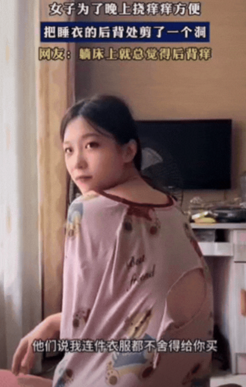 “笑不活了!”山东,女子为了挠痒痒方便,竟然把睡衣后背处剪了一个洞,老公发现后很不解,问好好的衣服,干嘛剪个洞?女子说不仅方便挠痒痒,而且大家都方便,吓得老公不敢接话了!网友:躺床上就总觉得后背痒!