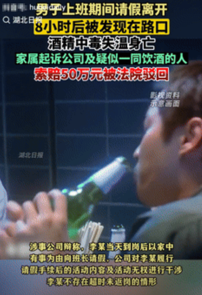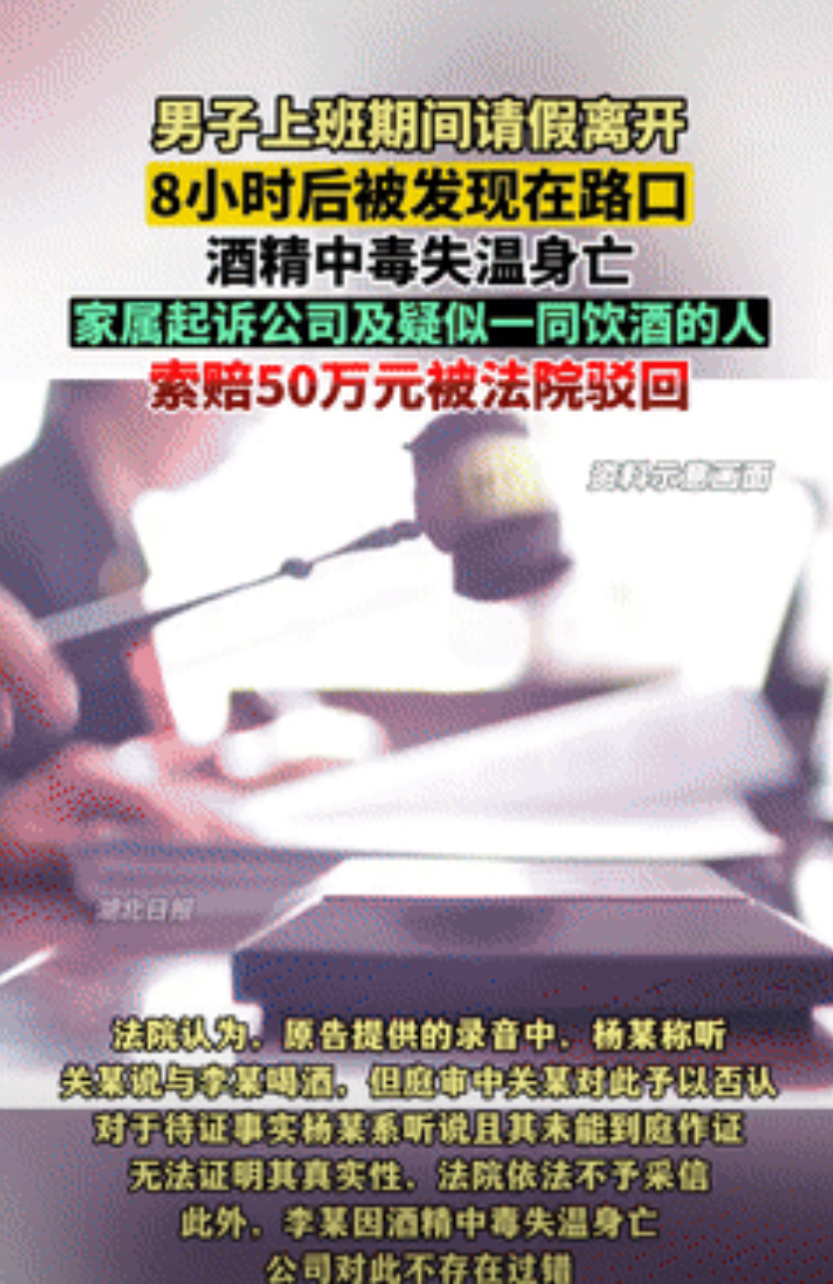 讹人成功了?据湖北日报8月26日的报道,辽宁鞍山,一男子上班期间请假离开,结果在第二天早上,有人发现他倒在马路边,没有了呼吸,经鉴定为酒精中毒失温死的,不料,事后家属却把公司和疑似酒友的人,一同告上了法院,索要50万的赔偿,法院判了! 凌晨5点多的辽宁鞍山,天刚蒙蒙亮,一位早起赶路的路人正沿着人行道快步走着,忽然,他瞥见街角的阴影里倒着个人,蜷缩在路边,像是喝醉了酒睡着了,路人心里一动,想着天凉,别是冻出个好歹,便走上前想叫醒对方。 可喊了两声没动静,他伸手推了推男子的肩膀,只觉得对方身体僵硬得吓人,路人心里“咯噔”一下,赶紧蹲下身探了探男子的鼻息,一点气息都没有!他吓得赶紧后退两步,掏出手机打了110和120。 等民警和医护人员赶到,确认男子已经死亡,法医鉴定结果很快出来:酒精中毒引发呕吐,加上凌晨低温导致失温,最终不幸身亡,而随着调查深入,这件事的来龙去脉也逐渐清晰。 去世的男子是附近一家公司的员工,事发前一天正上夜班,凌晨时分,他突然向领导请假,说有点私事要处理,领导痛快批了假,他便离开了公司,谁也没想到,这一别竟成了永别。 事后,男子的家属将公司和他的一位朋友告上了法院,索赔50万元,家属认为,公司在员工请假后没打一个电话关心,管理上有疏漏,他们手里也有录音,朋友曾打电话约男子喝酒,所以认为朋友作为同饮者,没尽到照看义务,才导致悲剧发生。 法庭上,公司觉得满肚子委屈,请假流程合规,出事地点也不在公司,这责任公司实在担不起,那位被起诉的朋友更是哭笑不得:“那天我确实喝了酒,但早就结束回家了,他打电话来的时候,我还劝他少喝点,根本没跟他碰面,怎么就成了‘同饮者’?” 法院审理后认为,公司对员工的私人时间没有监管义务,请假流程合法合规,不应承担责任,而仅凭一段约酒录音,无法证明男子出事前确实和这位朋友一起喝酒,也不能认定朋友有照看义务,最终,法院驳回了家属的索赔诉求。 这段判决结果传到网上,网友们大多觉得公正:“男子是在私人时间出事,又不是工作期间,公司确实没责任,总不能员工离开公司后,一举一动都要公司负责吧?”还有人说:“家属想找个说法能理解,但也得讲道理,不能谁都告”。 这件事也给所有人提了个醒:约人喝酒得谨慎,一旦同桌共饮,就得尽到提醒少喝,别让“酒局”变成“悲剧局”,更重要的是,喝酒要懂得适可而止,贪杯不仅伤身体,还可能在意识模糊时遭遇意外,就像这位男子,若不是喝到酒精中毒,或许就不会在低温中失去意识,也就不会有这场悲剧。 生命只有一次,别让一时的贪杯和疏忽,给家人留下永远的痛。 对此,您怎么看?