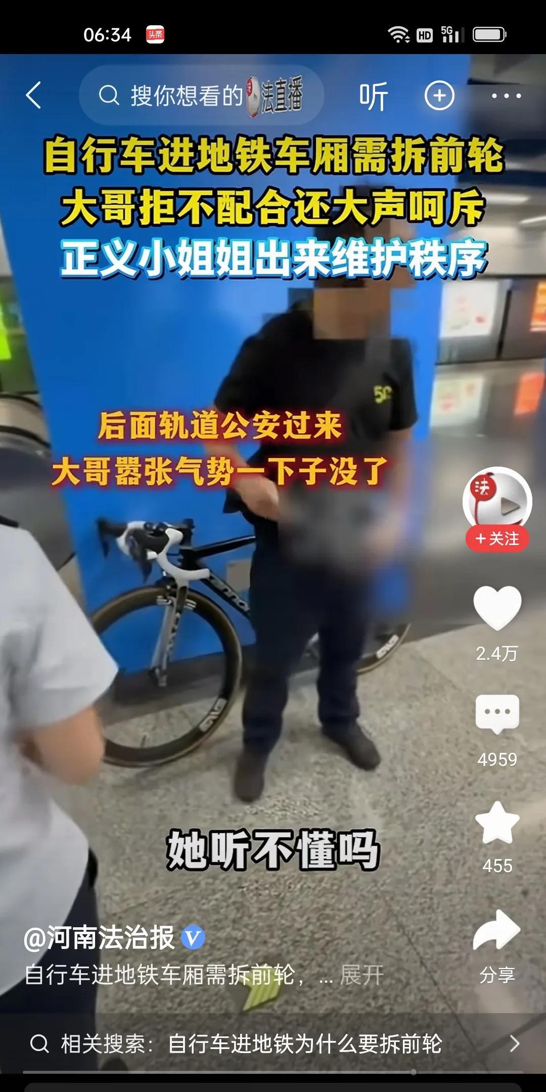 大哥骑着自行车准备进地铁。工作人员跟他说,自行车进车厢必须拆前轮。大哥看工作人员是个小姑娘,拒不配合,还大声呵斥。旁边的小姐姐看不下去了,站出来为工作人员发声,说是这样的,你凶人家干嘛?大哥说,来,我拆下来,你给我拎?小姐姐说,我为什么给你拎?大哥语出惊人,你有病。说完,大哥把自行车推到小姑娘面前,来,你帮我拆吧。小姑娘不知所措。这时来了一位轨道公安,说姑娘没说错,就是要拆。大哥才收敛,老老实实的把前轮拆了。