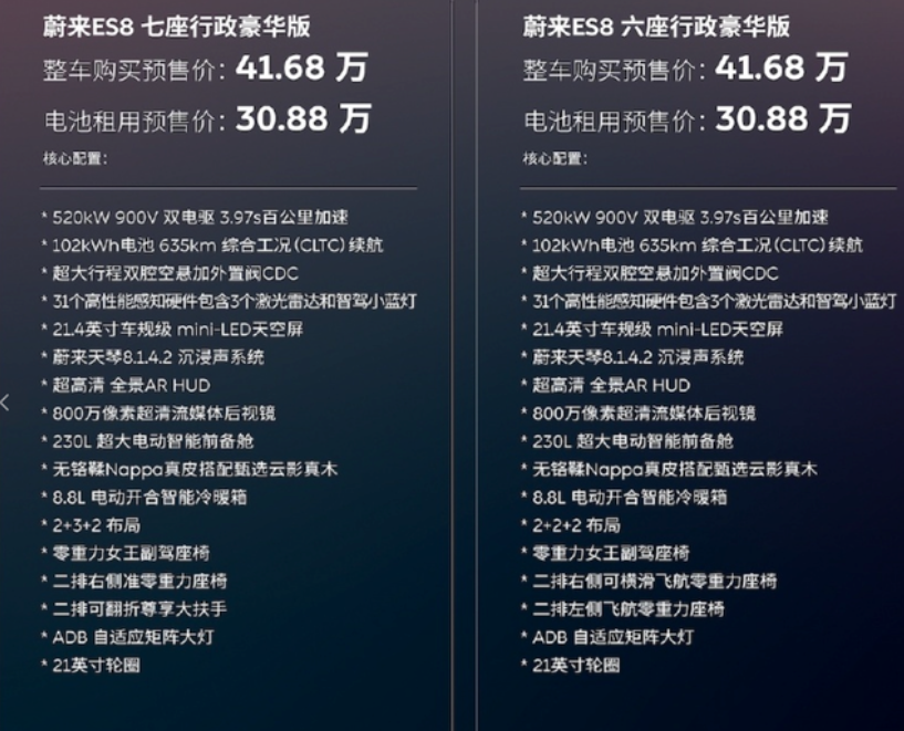 三代蔚来ES8签名版和豪华版的区别 豪华版买断预售价是41.68万 签名版是45