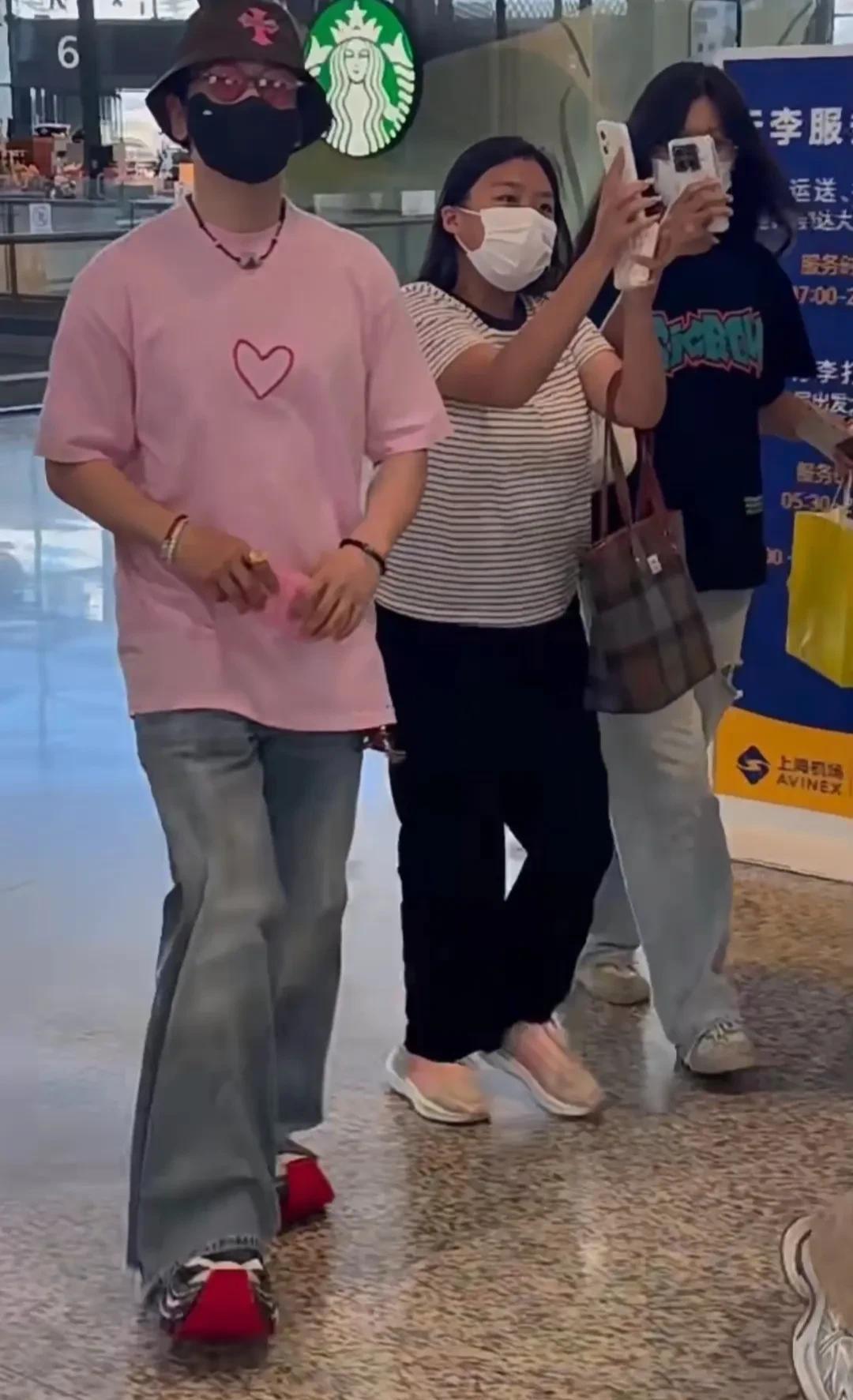 今天七夕,黄晓明现身机场宠粉!只见他穿了粉嫩粉嫩的短袖,手拿粉嫩的瓶子,戴的深咖色帽子上绣一个粉色图案。你以为这就完了?还有粉色眼镜! 他也知道中年男人穿这一套不敢露脸,要捂得严严实实,要不然油腻感又来。 脚上是外出永远不会换的厚底增高鞋。