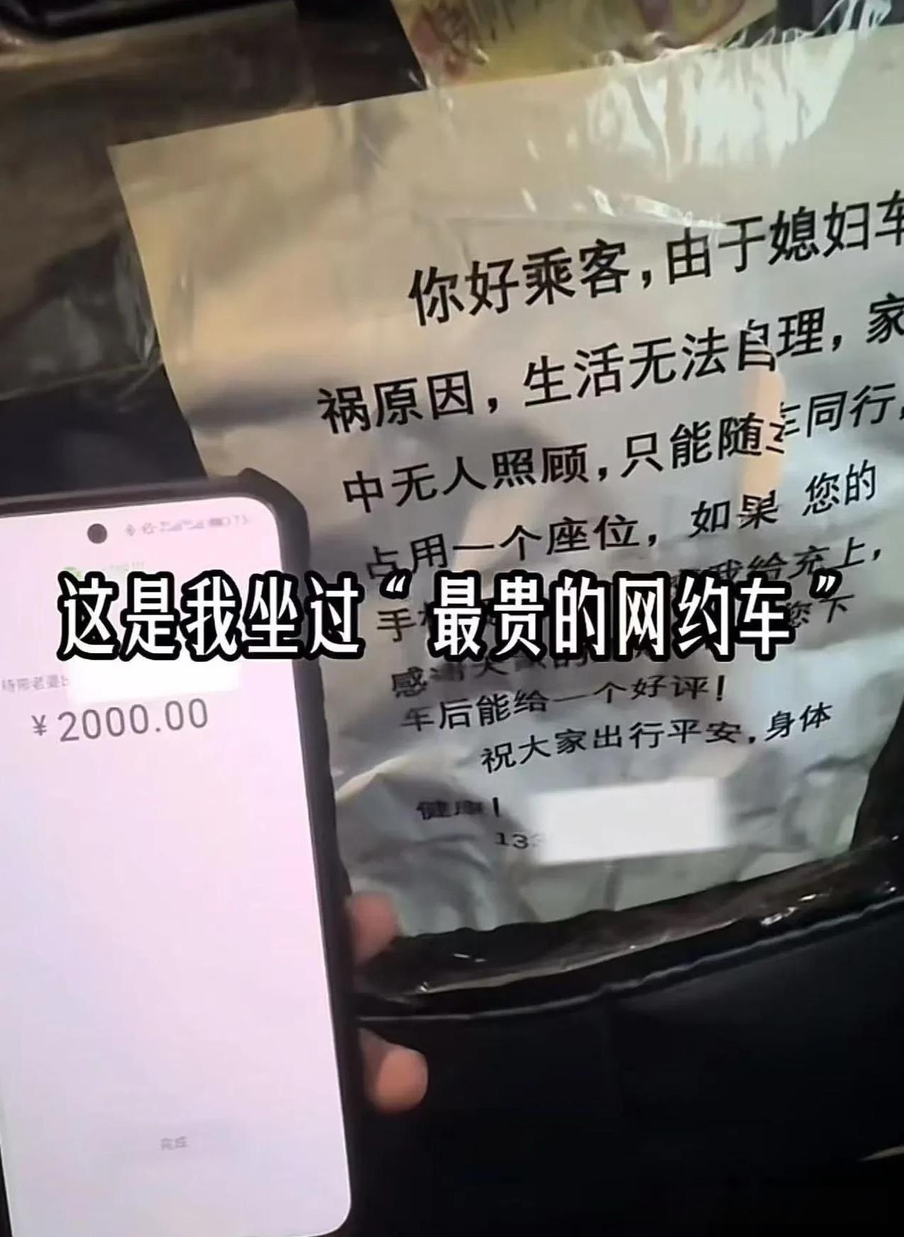 男子打了一辆网约车,司机不仅迟到,而且到的时候副驾还坐了一个人。男子顿时心生不爽,可是当他坐进车里看到一样东西,瞬间气消,还额外转账给司机2000块钱!网友:这肯定是最安全的网约车,因为司机师傅最爱的人也在车上! 男子叫了一辆网约车,司机师傅姗姗来迟,更让他意外的是,副驾驶位置上还坐着一位大姐! 男子怀疑司机是不是绕路去接其他乘客了,心里那股子不爽劲儿一下子就冒了上来。 司机师傅满脸歉意地解释道:“实在不好意思,路上堵车太严重了。” 男子见司机师傅态度诚恳,又考虑到自己确实赶时间,便打开车门上了车。 可当他坐好以后,瞬间愣住了。只见副驾驶后背贴着一张纸,上面清晰地写着:您好,乘客朋友,因车祸导致生活无法自理,家中又无人照料,只能随车同行,占用一个座位……感谢您给予的理解,希望您下车后能给我一个好评…… 原来如此,这坐在副驾上的女子并非普通乘客,而是司机师傅的妻子啊。 司机师傅担心男子会因此投诉,便小心翼翼地讨好男子说:“小伙子,后边有水,你要是需要充电,我这就给你找充电线。” 男子为了让司机师傅放宽心,关切地说道:“嫂子这样坐着肯定不舒服吧,没事的,可以把座椅往后调一点!” 听男子这么说,司机师傅悬着的心终于落了地,他一脸感激地说:“感谢兄弟的理解!” “没事没事,你副驾有个人,之前有乘客抱怨过吗?”男子好奇地问道。 司机师傅无奈地笑了笑,说道:“一开始啊,还真有抱怨的,甚至还有人举报。平台还因此给我停了几天车。后来我闺女给我写了这张纸条,从那以后就再没遇到这种情况了。” 男子注意到,每次遇到红绿灯,大哥都会下意识地留意妻子,那关切的眼神、温柔的动作,想必他一定很爱她吧! 男子又关切地问道:“你每天都带着嫂子出车吗?” “是的,把她放在家里我不放心。她日常生活不能自理,让她跟着我出车,还能看看外面的风景,心情也能好一点。”司机师傅回答。 “大哥,那你也要多注意身体啊!”男子真诚地说道。 “好的,谢谢兄弟。我身体还行,就是腰有点不太好,晚上总担心她,也睡不踏实。” “那这个每天收入怎么样?”男子接着问道。 “哎哟,不行啊,也就勉强够个生活费。我每天开车的时间也不能太长,老伴也受不了,送完你我也就回家了。”司机师傅无奈地摇摇头,忍不住叹了口气。 男子看到司机师傅生活如此不易,又注意到车上有一个二维码,下车的时候,他毫不犹豫地扫了码,转了2000块钱过去。 之后,男子把这件事发到了网上,他说这是自己打过“最贵的网约车”,但内心却无比开心。 此事引发了热议,有网友说,你坐的是世界上最安全的车,因为车上有他的全世界! 也有网友说,写了个纸条,投诉就没了,证明社会还是好人多。 还有网友说,这个大哥绝对是个好男人,对老婆不离不弃!有多少男人可以做到这样? 在这个平凡又温暖的邂逅里,我们看到了司机师傅对妻子不离不弃、悉心照料的深情,这份爱如冬日暖阳,温暖而珍贵。 也看到了男子善良与体贴,他的慷慨与理解,让这份人间温情更加熠熠生辉。 他们的故事,宛如一首动人的歌谣,奏响了人性中最美的乐章,让我们坚信,人间处处有真情,世间永远有温暖!