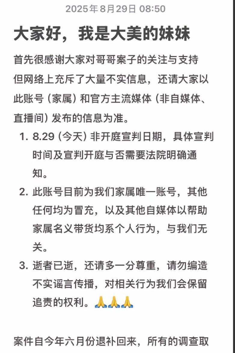 大美妹妹辟谣,29号非开庭宣判日,但大美妹妹也说了,所有调查取证工作已经全部完成,相信很快就能等到结果! 像大美师傅、小宝这些与罗大美亲近的人发视频搞直播都可以理解,毕竟人家也得养家糊口。 网上竟然还有冒充大美妈妈卖货的,这家人都这么惨了,这样做实在是有点说不过去。 盼星星盼月亮,终于要出结果了,又高兴又难过。 无论怎么判,罗大美终是被害了,这是无法改变的事实。 一审如果没有达到家属预期,还得继续上诉。 好在尚家还有个能干的小妹,因为她才有更多的网友和媒体关注这个案子。 杨余沙三人,等待结果的日子对他们来说何尝不也是一种煎熬,这把好日子终于是要过到头了!