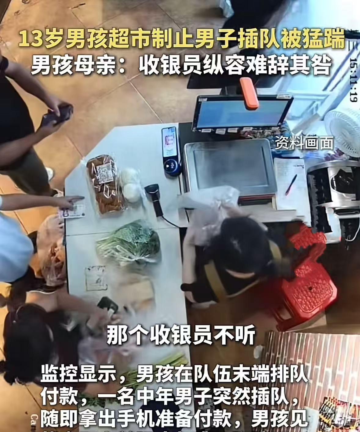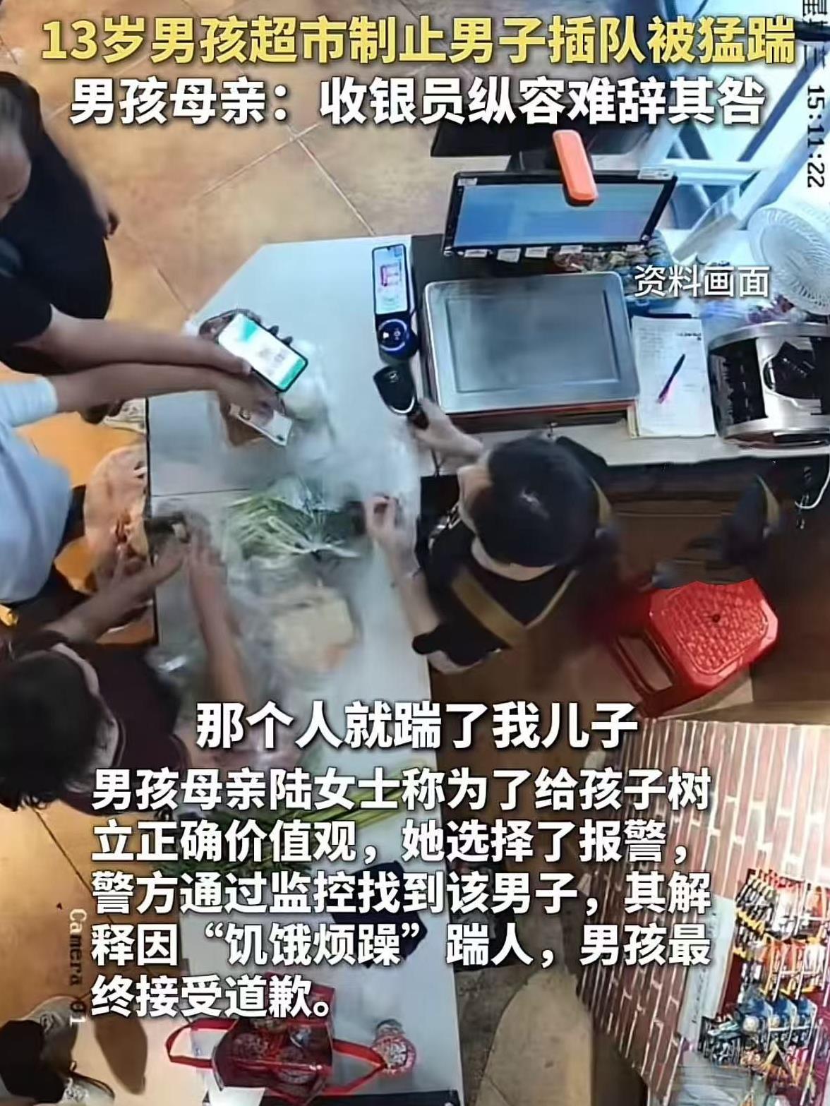 湖北宜昌,13岁男孩在超市排队付款时,一男子突然插队,拿着购买的东西和手机就准备付款,男孩见状立即制止,谁知,男的回头就给男孩一脚,骂骂咧咧的拿着东西走了,男孩母亲见状立即报警,称要给孩子树立正确的价值观,警方最终找到男子,男子称自己太饿了,因饥饿烦躁没控制住。同时男孩母亲认为超市收银员纵容插队也难辞其咎!网友:饥饿烦躁不能成为插队和伤人的理由! 法治进行时8月28日报到,13岁的男孩跟妈妈去超市购物,完事之后规规矩矩排队付款。 眼看前面两个人付款完事要到男孩,却突然插进来个陌生人。 陌生男人拿着零食直接放到收银台上,拿出手机就要结账。 男孩见状先是一愣,然后礼貌的说:叔叔,大家都在排队呢,你得按顺序来。 谁知道那男的听完并没有搭茬,而是瞪了一眼男孩。 拿出手机就要付款,男孩见状就跟收银员说:阿姨,我先来的,你不要去扫他的码。 谁知道那收银员跟没听见一样,就准备要扫码,男孩见状就用手挡了一下。 可没成想,那男的二话没说,抬起脚就把男孩狠狠的踹了一脚,随即骂骂咧咧的拿着东西就走了。 孩子没站稳,踉跄着差点摔在地上,吓得周围排队的人都吓了一跳。 男孩母亲陆女士见状,赶紧冲过去护住孩子,一边检查他有没有摔着碰着,一边掏出手机就报警。 她之所以没有选择冲动行事,而是希望给孩子树立正确的价值观。 他希望孩子明白,在面对不公正和违反规则的行为时,勇敢地站出来是对的。 坚持正确的事没错,做错事的人也一定会受到惩罚。 警方接到报警后,迅速展开调查。通过监控很快锁定并找到了男子。 面对询问,男子给出的解释令人难以接受,他称自己是因为饥饿烦躁,失去了对情绪的控制,才做出如此冲动的行为。 经过调解,男子给男孩道歉,没想到男孩却展现出了超越年龄的宽容,选择接受道歉。 事后,陆女士认为超市收银员在整个事件中同样难辞其咎。 当时收银员在男子插队时,并未进行任何劝阻和制止,这种不作为实际上是对插队行为的一种默许和纵容。 当自己儿子遭到伤害时,收银员也没有及时采取任何措施。 仿佛眼前发生的一切与她无关,依旧自顾自地工作。 这种冷漠的态度,不仅让男孩在身体上受到伤害后,心理上又遭受了二次伤害,也让陆女士感到无比失望。 收银员的失职行为,反映出超市在员工培训和日常管理方面存在不足。 陆女士多次尝试与超市老板进行沟通,希望超市能够认识到问题的严重性,并采取相应的改进措施。 但令人遗憾的是,她的沟通请求如同石沉大海,一直未得到超市老板的任何回复。 大家都认为陆女士做得对,就该较真,不然以后守规矩的人越来越少,没素质的人越来越嚣张! 《治安管理处罚法》第23条:有下列行为之一的,处警告或者二百元以下罚款;情节较重的,处五日以上十日以下拘留,可以并处五百元以下罚款: (一)扰乱机关、团体、企业、事业单位秩序,致使工作、生产、营业、医疗、教学、科研不能正常进行,尚未造成严重损失的; (二)扰乱车站、港口、码头、机场、商场、公园、展览馆或者其他公共场所秩序的; (三)扰乱公共汽车、电车、火车、船舶、航空器或者其他公共交通工具上的秩序的; (四)非法拦截或者强登、扒乘机动车、船舶、航空器以及其他交通工具,影响交通工具正常行驶的; (五)破坏依法进行的选举秩序的。 男子插队的行为,扰乱了超市这一公共场所的秩序,违反了该条规定。 如果其插队行为未造成严重后果,一般会给予警告或罚款处罚。 《治安管理处罚法》第43条:殴打他人的,或者故意伤害他人身体的,处五日以上十日以下拘留,并处二百元以上五百元以下罚款;情节较轻的,处五日以下拘留或者五百元以下罚款。 男子因插队被男孩制止后,脚踹男孩,其行为属于殴打他人。 虽然男孩最终接受了男子的道歉,但男子的行为仍违反了该条规定,应受到相应的治安管理处罚。 《未成年人保护法》第6条:保护未成年人,是国家机关、武装力量、政党、人民团体、企业事业单位、社会组织、城乡基层群众性自治组织、未成年人的监护人以及其他成年人的共同责任。 超市作为公共场所的经营管理者,收银员对男子插队行为视而不见。 在男孩被踹后也未采取任何措施,也确实没有尽到保护未成年人的责任。 对此,您怎么看呢? #头号创作者激励计划#