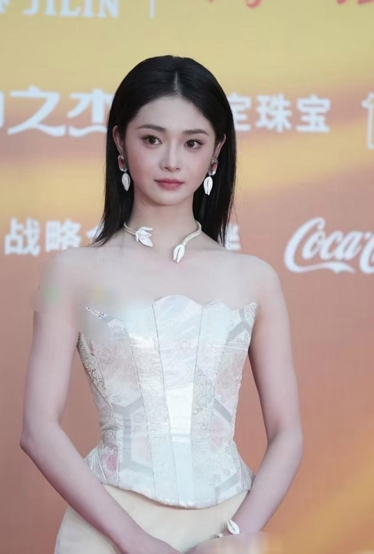 身着优雅米色抹胸长裙的周洁琼立于红毯之上,尽显端庄美丽。