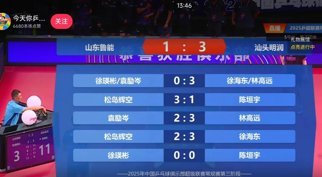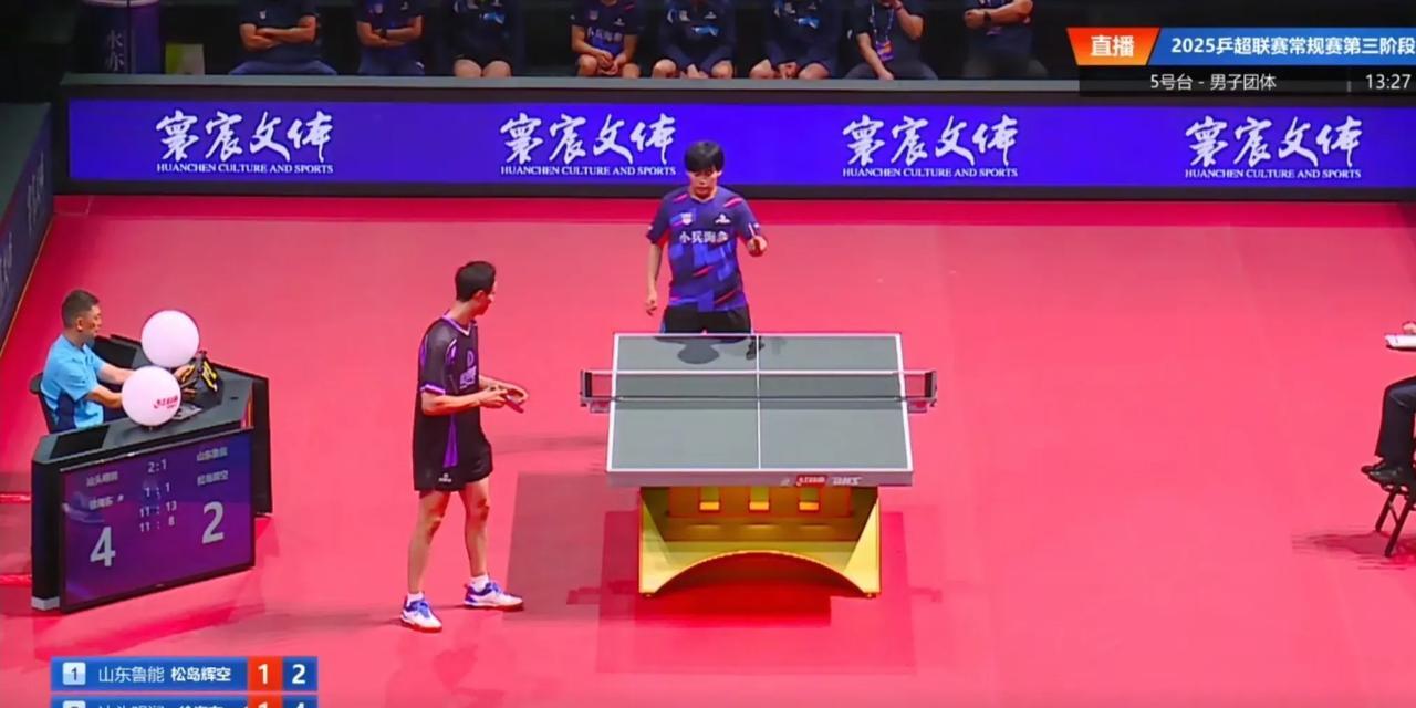 乒超联赛第三阶段(乌鲁木齐),山东鲁能对阵汕头明润队。第四场,松岛辉空被徐海东逆