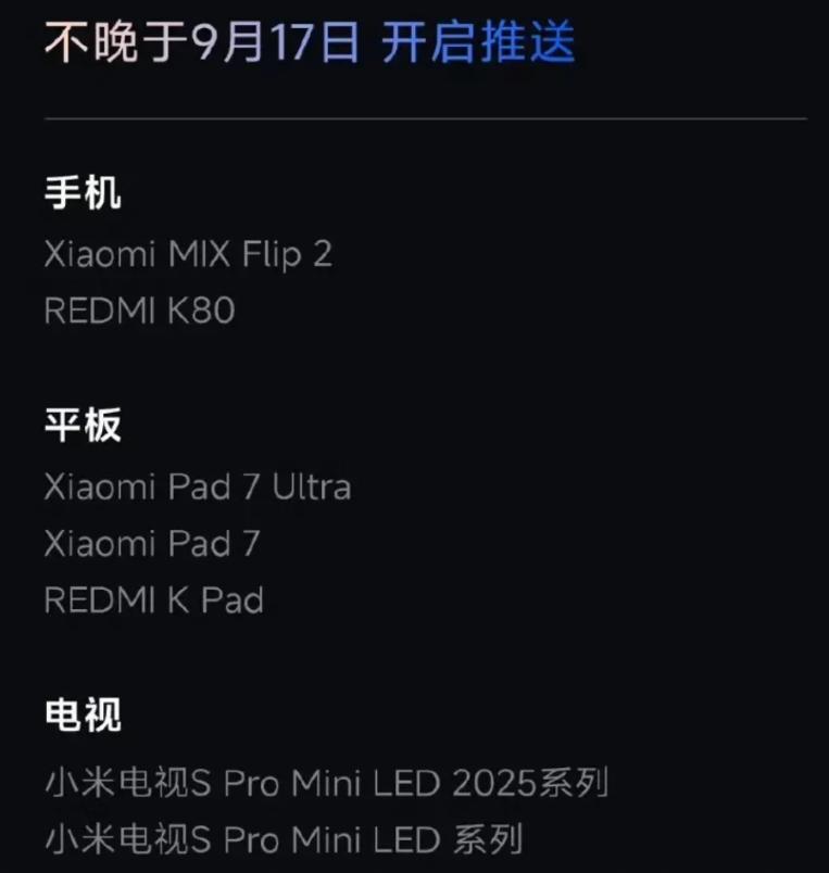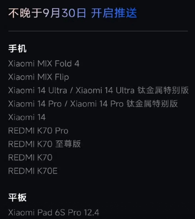 第一批:小米15系列,红米K80部分机型,小米平板7部分机型。时间:8.29。