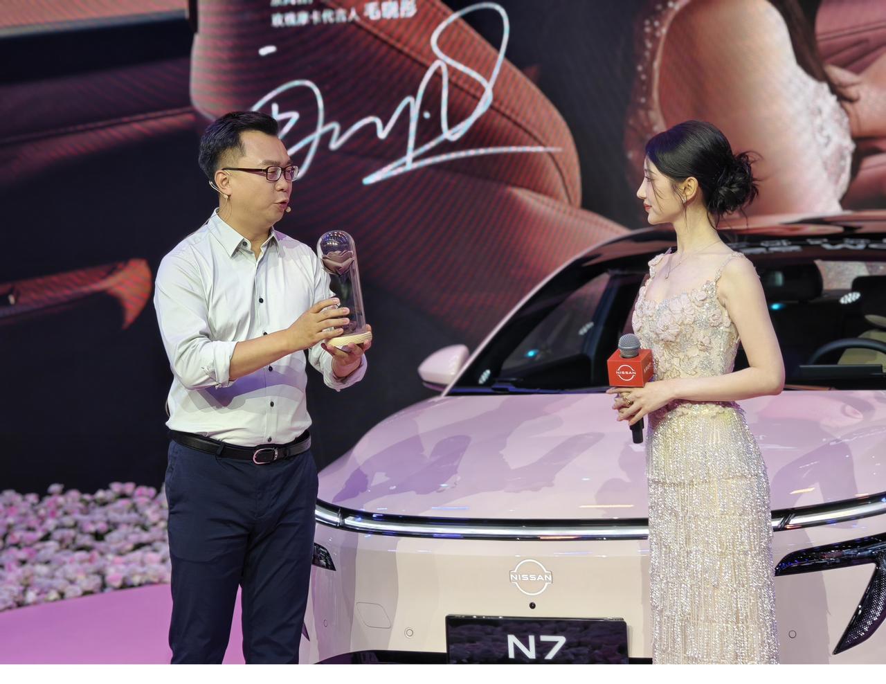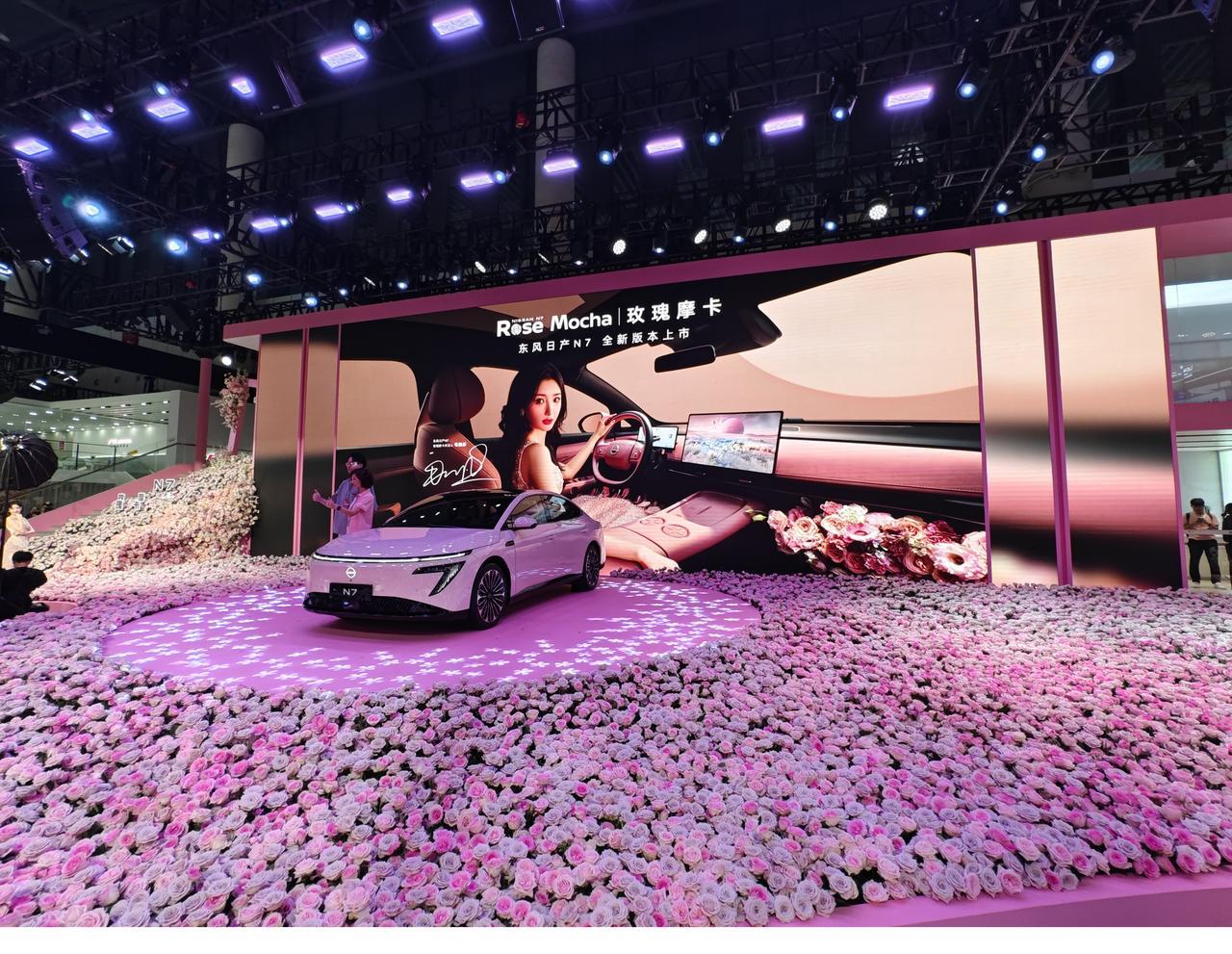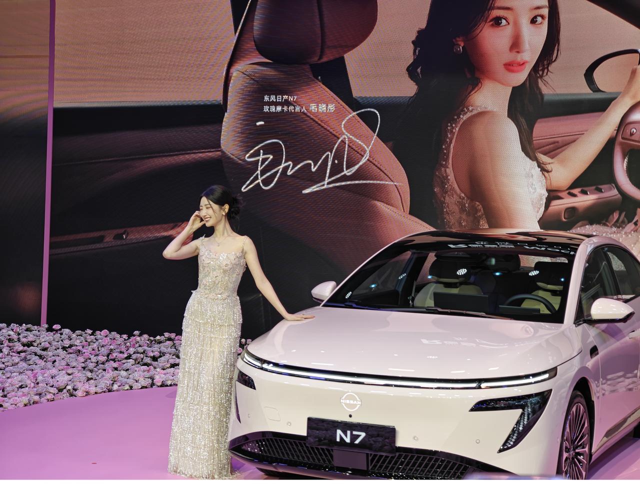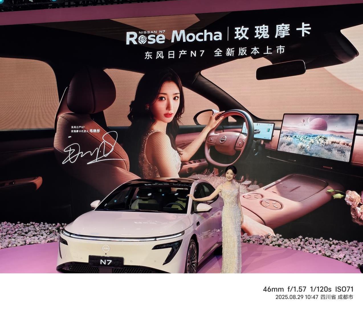 东风日产N7今天发布新配色新内饰版本,玫瑰摩卡,还请来了代言人毛晓彤,真的好美啊,身材姿态气质都好棒,你看我拍的生图都这么美,赏心悦目。 今天东风日产N7的展台也是非常的美,玫瑰花遍布整个展台,置身花海,浪漫无限,没有女生不喜欢吧,我这个大老爷们都被震撼到了。买一个这个配色的车送给女朋友或者老婆很好,价格还实惠。而且新配色新内饰都限时免费,还送了5000元的选装基金。七月初七,七夕开N7!