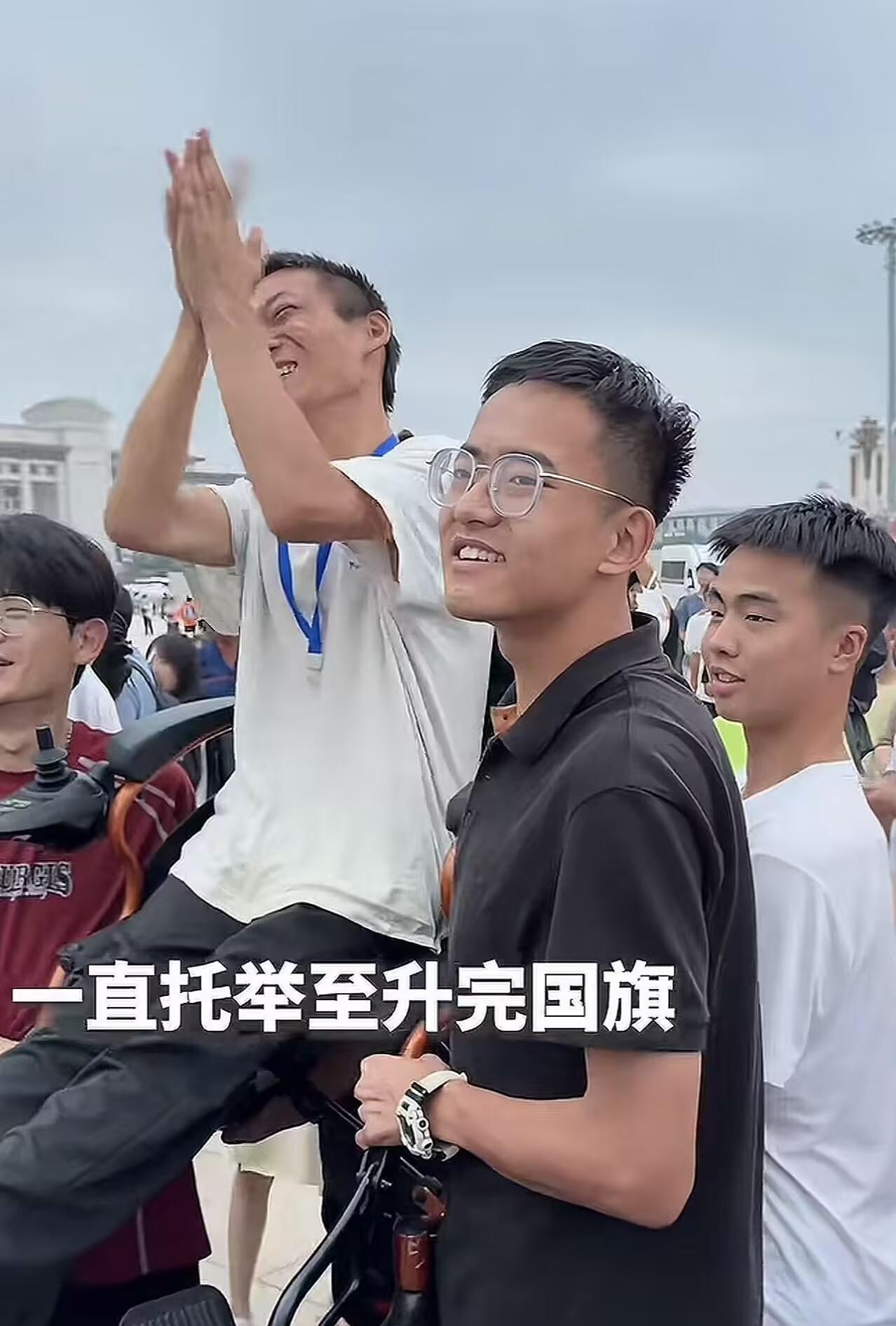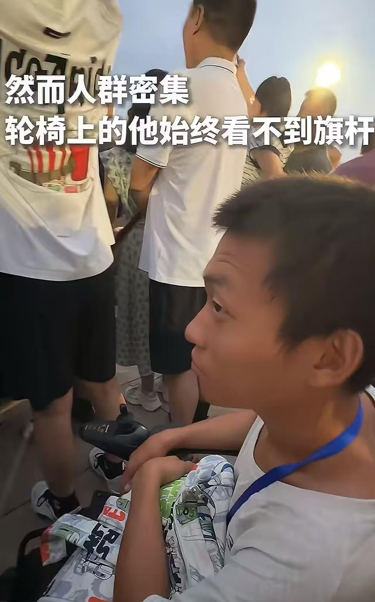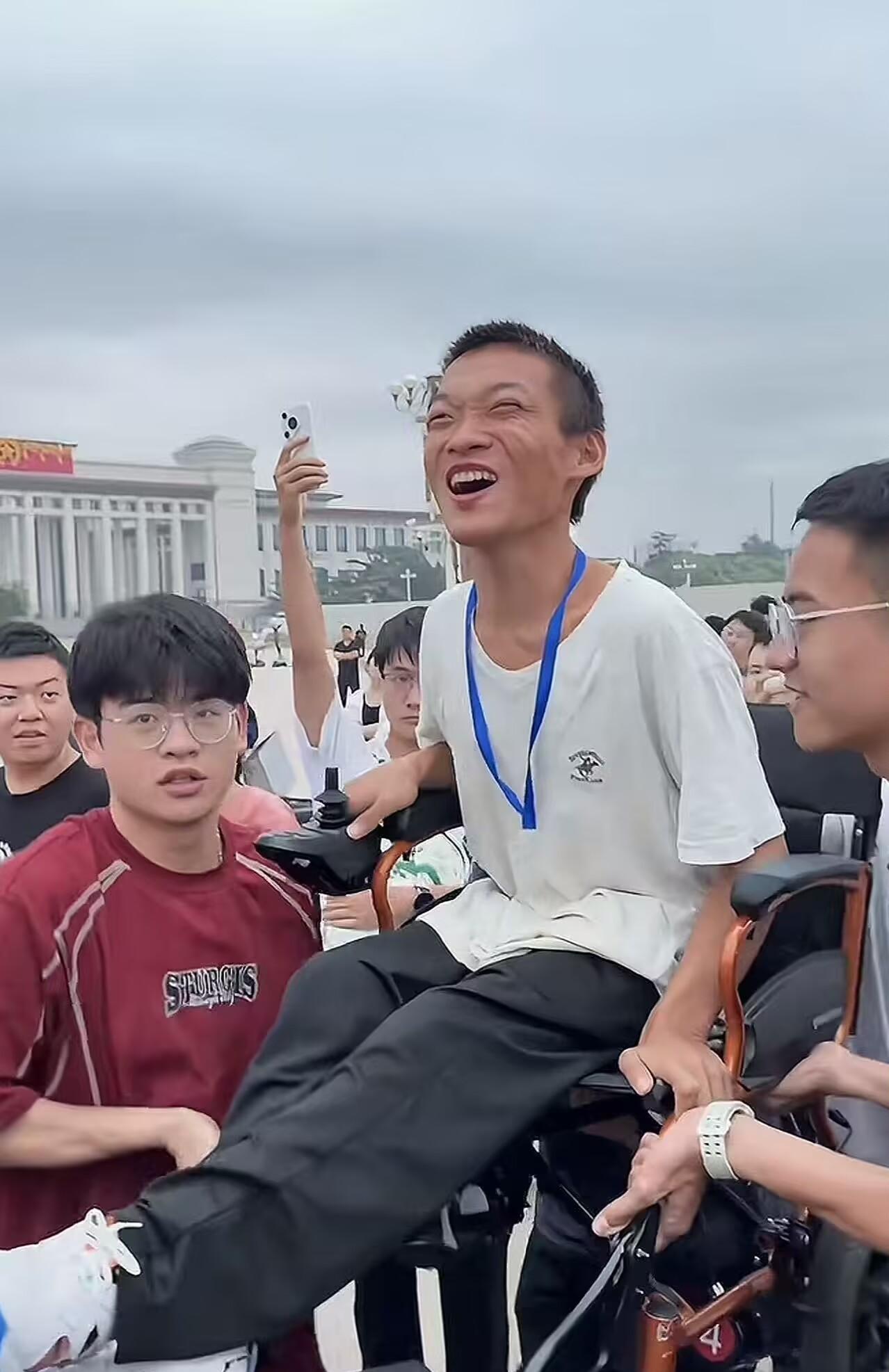 看哭了!脑瘫男孩坐着轮椅去天安门看升旗,可是前面一群密密麻麻地人挡住他的视线,他坐着什么也看不到!就在他一脸失望的时候,旁边一个小伙动员大家:“我们一起把他抬起来吧,他来一次不容易,一辈子可能就这么一次机会!”而接下来的事情令人泪目! (来源:人民日报) 男孩因为脑瘫,从小就无法像正常孩子一样自由自在地行走,日常出行只能依靠轮椅。 但他的内心深处,一直藏着一个炽热的愿望:去天安门广场,亲眼目睹一次庄严的升旗仪式。 然而,现实却像一座难以逾越的大山横在他面前。自己连正常出门都困难重重,又怎么可能坐着轮椅,一路颠簸前往遥远的北京呢? 每当想到这里,男孩总会忍不住自嘲地笑笑,觉得这个想法不过是天方夜谭,根本不可能实现。 但命运总是充满了惊喜和意外。男孩的一位异性好友得知了他的心愿后,坚定地对他说:“我带你去北京看升旗,帮你圆这个梦!” 那一刻,男孩眼中闪烁着希望的光芒,仿佛看到了梦想照进现实的曙光。 在好友的悉心帮助下,男孩坐着轮椅,来到天安门广场。 虽然天还未亮,但广场上早已人山人海,大家都怀着无比崇敬和期待的心情,等待着那神圣的升旗时刻。 可惜的是,由于男孩坐在轮椅上,行动不便,没能抢到前排的有利位置,只能被人群挤在外围。 他努力地伸长脖子,却只能看到前面密密麻麻的人头,根本无法看到升旗的场景。 那一刻,男孩的心中充满了失望和沮丧,他不远千里来到这里,难道最终还是要与梦想擦肩而过吗? 就在男孩感到无比失落的时候,旁边一个穿着红色衣服的小伙注意到了他的情绪。 小伙大声呼吁周围的人:“大家帮帮忙,把这个男孩的轮椅抬起来,让他也能看到升旗!他来一次不容易,一辈子可能就这么一次机会!” 周围的人虽然互不相识,但他们的心却紧紧相连。很快,就有几个热心的男生站了出来,表示愿意帮忙。他们齐心协力,小心翼翼地将男孩的轮椅稳稳抬起。 当激昂的国歌响起,鲜艳的五星红旗冉冉升起的那一刻,男孩在一群陌生路人的温暖托举下,终于实现了在天安门广场看升旗的梦想。 他的眼眶中闪烁着晶莹的泪花,那是激动、是感恩、更是对生活的热爱。这种感动,在他心中,仅次于自己双腿能够恢复走路! 此事引发了热议,有网友说,哪有什么残不残疾,他只是不方便嘛,不方便咱们就给他行个方便! 也有网友说,一群“余华”托起了“铁生!国旗下做一件好事,何尝不是一辈子最有意义的事。 还有网友说,这就是中国新青年的情怀成全了一个人,快乐了一群人,温馨了全网的人! 正是有了这样一群有担当、有爱心的青年,我们的国家才充满了力量,我们的民族才充满了希望。