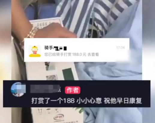 “笑麻了!”8月28日,四川成都,一女子住院期间点了份外卖,不料,骑手突然给她打来电话,说他刚出了事故,要去医院治疗,没办法给她送了,女子正失望时,骑手再次打来电话,告诉女子自己被送去的医院和她是同一家。女子听后立即举着输液杆,在楼下等候骑手。网友:第一次见开救护车送外卖的! 外卖的出现,确实方便了人们的生活,除了食物,药品、工具等也可以点外卖,不用出门就能买到东西。 27日这天,钟女士因为突然发高烧,被送往医院治疗,打了一天的针后,她的病情得到了好转。第二天,钟女士便打算买点好吃的犒劳下自己。 由于出行不方便,终于是就点了份外卖,结果没过多久,骑手就给她打来电话,说自己取餐时摔伤了,没法继续送外卖了。 钟女士虽然伤心,但这也是没办法的事,挂断电话后就和商家协商一下怎么整,结果,骑手再次打来了电话,表示等会自己也会被拉到她所在的那家医院,会把外卖给她捎过去。 钟女士听后又开心起来,随即推着输液杆来到救护车停靠的地方等待骑手,很快,骑手就从救护车上下来了,护士小姐姐将外卖交给了钟女士。 看到这滑稽的一幕,钟女士忍不住哈哈大笑起来,没想到还有这么巧的事。 之后,钟女士给骑手打赏了188元的大红包,还提了箱牛奶去看望对方,希望对方能够早日康复。 网友看后表示,这就是缘分啊! 信息来源:《住院病人点外卖,骑手意外受伤搭救护车顺利送餐,顾客:两个伤员碰面了》潇湘晨报