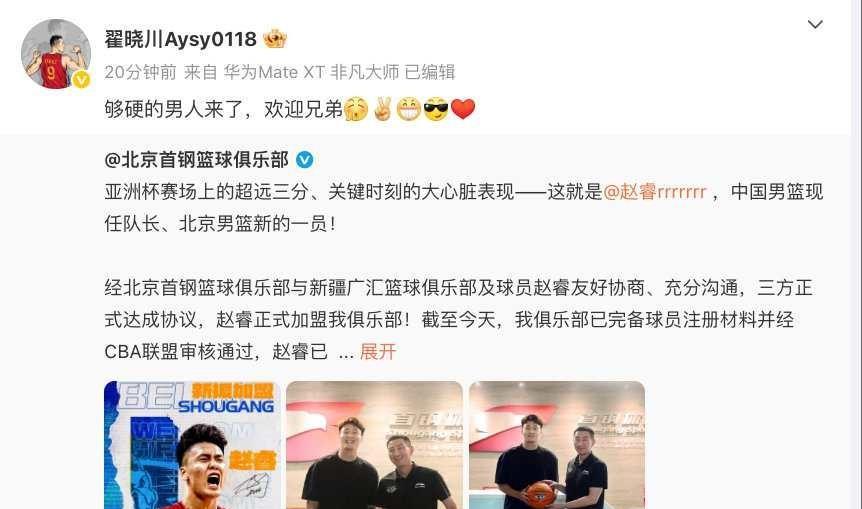这就是双向奔赴!赵睿感谢!众队友发文欢迎 确认过眼神,赵睿是北京队想要的人,北京