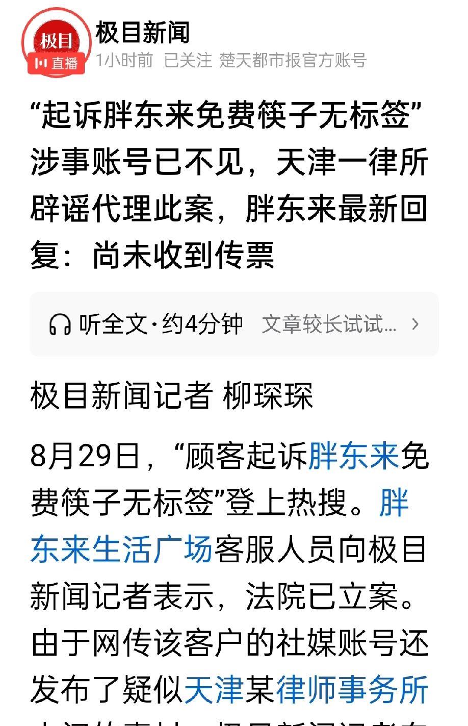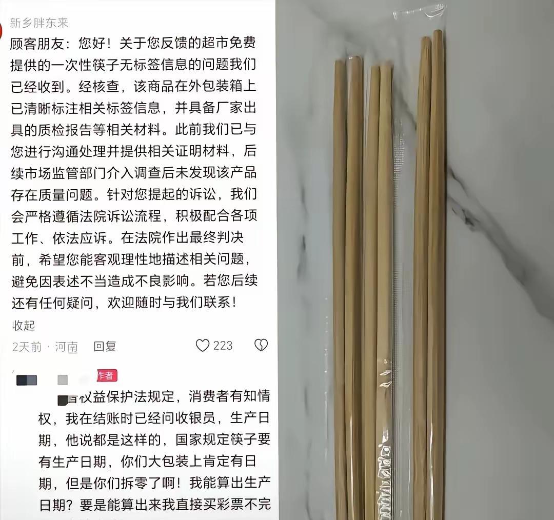 一人起诉胖东来筷子没生产日期,全国餐饮老板都瑟瑟发抖。 这位天津人好像是职业打假人,跑到千里之外的河南新乡,起诉胖东来送的免费一次性筷子没有生产日期,不合格,违反了相关法律。 胖东来回应,筷子整体包装箱上有生产日期,是合格的,但每双筷子上确实不显示生产日期,这个行业都这样。 然而,这位天津人并不认可,还真就叫真起诉了。 这是叫真吗? 在我看就是没事找事,吃饱了撑的,其醉翁之意不在酒,就是奔赔偿赚钱去的。 一双筷子惹的祸,惊的却是全国数百万大小餐厅老板。 放眼全国,可有一家餐厅里的筷子显示生产日期的?若这个天津人碰瓷成功了,全国的餐厅老板都要头痛了。 而让人惊叹的是,竟然就有律师认可并支持这位碰瓷胖东来筷子的天津人。 这要是成功了,餐厅里的食材调料是否也要显示生产日期?不然,服务员端上一盘青椒肉丝,就说青椒和肉丝不显示生产日期,这不合格,这违法了,要赔钱,感觉这个世界也就乱了。 #胖东来纠纷# #胖东来食品安全# #胖东来餐具# #胖东来木筷#